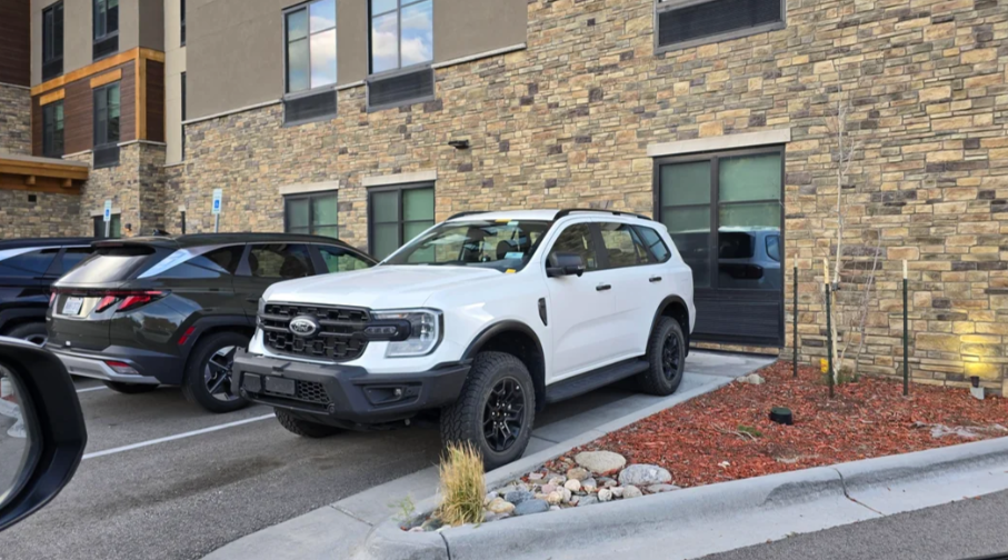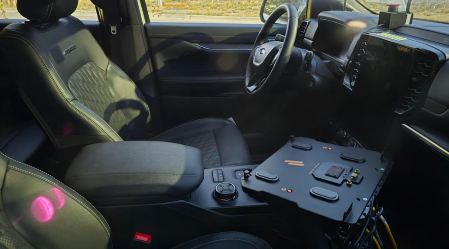 Пофарбований у білий колір Everest оснащений укороченим бампером і чорними легкосплавними дисками з масивними шинами, що нагадує комплектацію для бездоріжжя Ranger Tremor. У салоні – шкіряні сидіння з контрастною строчкою доповнені шильдиками Platinum. Також можна помітити док-станцію для ноутбука і додаткове обладнання, які вказують, що це авто частина програми розробки.