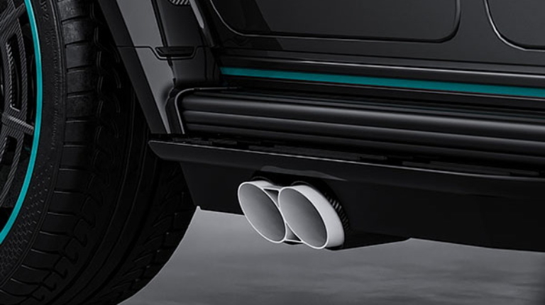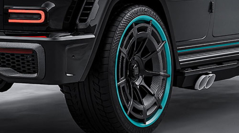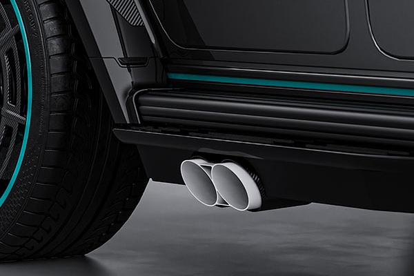 Більшість зовнішніх кузовних елементів, а також унікальний капот, виконані з вуглецевого волокна. Градієнтне сріблясто-чорне забарвлення виконане у стилі лівреї гоночної команди Хемільтона – AMG Petronas F1. Про неї ж нагадують бірюзові акценти та окантування 23-дюймових кованих дисків з низькопрофільною гумою Michelin. Цікавою деталлю екстер’єру стали білі керамічні патрубки вихлопної системи, розташовані по обидва боки кузова.