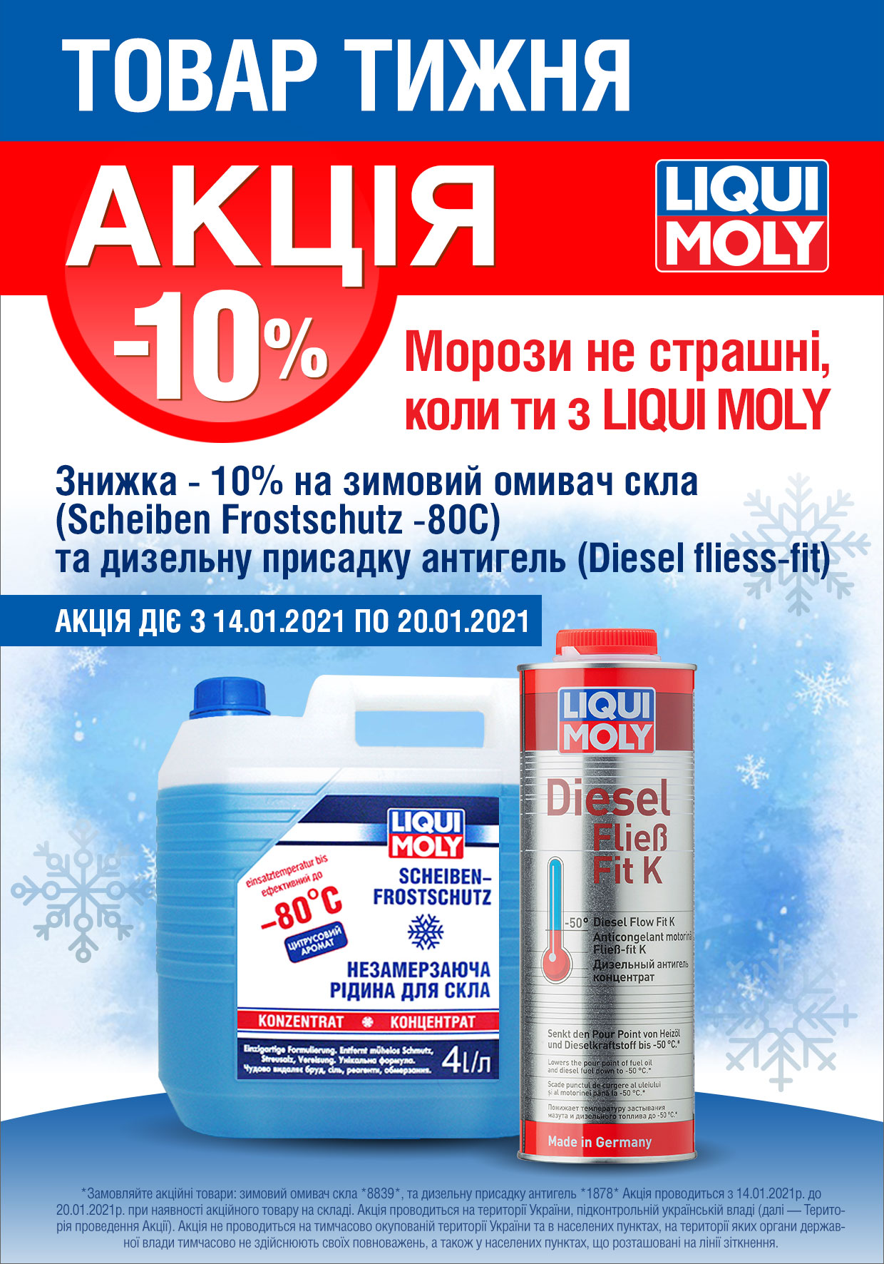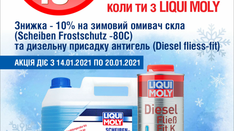 Морози не страшні, коли ти з LIQUI MOLY! Лише тиждень, з 14.01. 2021 по 20.01.2021*, по всій території України діє знижка – 10% на зимовий омивач скла (Scheiben Frostschutz -80C) та дизельну присадку антигель (Diesel fliess-fit).