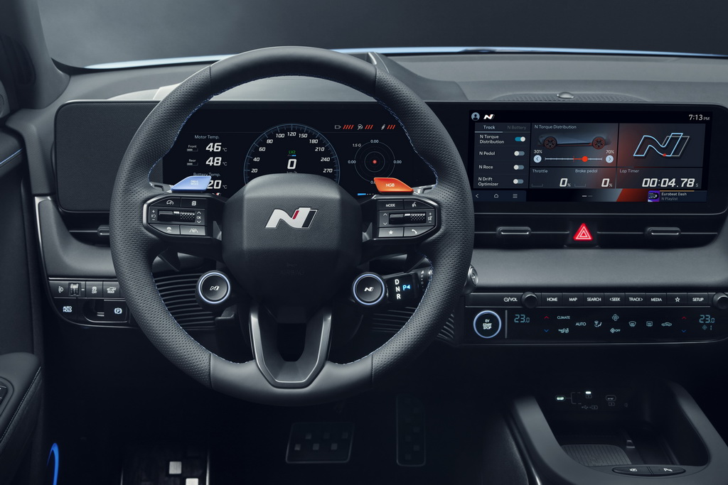 Інтер’єр Ioniq 5 N чітко передає стиль сімейства N завдяки використанню фірмових елементів N, включаючи кермо, сидіння, накладки на дверях, металеві педалі та інші деталі, що оптимізують автомобіль для їзди по треку.