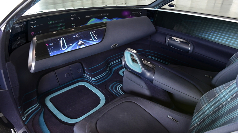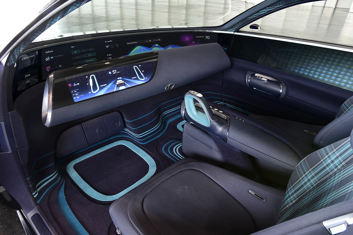 Интерьер концепта был невероятно футуристичным, но до серийной версии большинство решений не дошло. Как показано на шпионских фото, в кабине будет установлено рулевое колесо, крупный экран, который объединяет в себе цифровую приборную панель и мультимедийную систему с поддержкой голосового управления. Отделка салона выполнена из экологически чистых материалов с применением тканей, полученных путем переработки пластика.