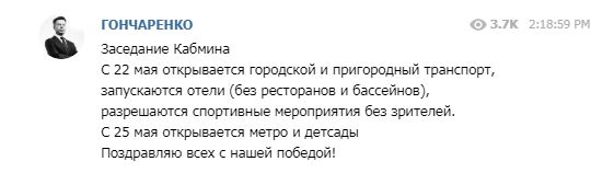 Після того, як в Україні послабили карантинні заходи, дороги великих міст знову наповнилися автомобілями. Однак, громадський транспорт, як і раніше, не працював, що змусило багатьох автомобілістів їздити на роботу на своєму транспорті, а тих, у кого такого немає — користуватися послугами таксі. У зв’язку з цим на дорогах великих міст зібралася велика кількість машин, серйозно ускладнивши трафік. Але влада країни нарешті ухвалила рішення відкрити метрополітен у Києві, Харкові та Дніпрі.