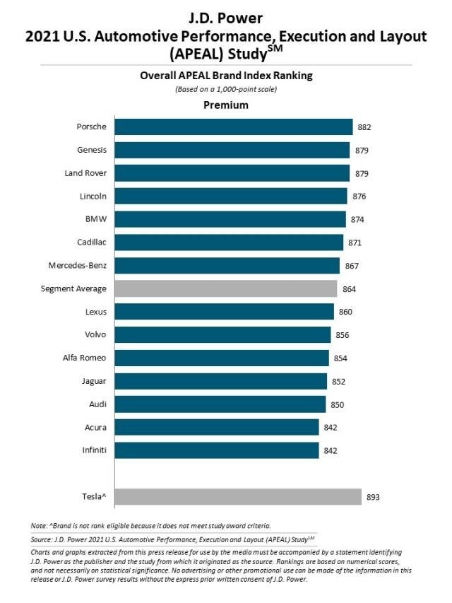 У преміальному сегменті лідером стала марка Porsche (882 бали). За нею йдуть Genesis і Land Rover, які отримали від експертів по 879 балів. Компанію Tesla не вносили в загальний список, а виділили в окрему категорію. Це пов’язано з тим, що американська марка не дає дозволу аналітичним агентствам опитувати своїх клієнтів. Але це не завадило їй набрати 893 очки і стати найпривабливішим брендом для автомобілістів.