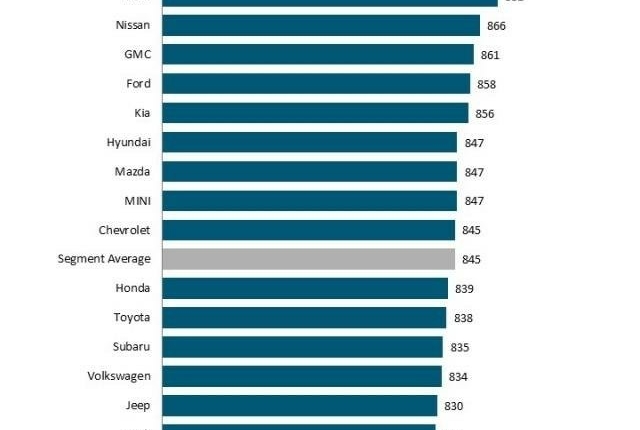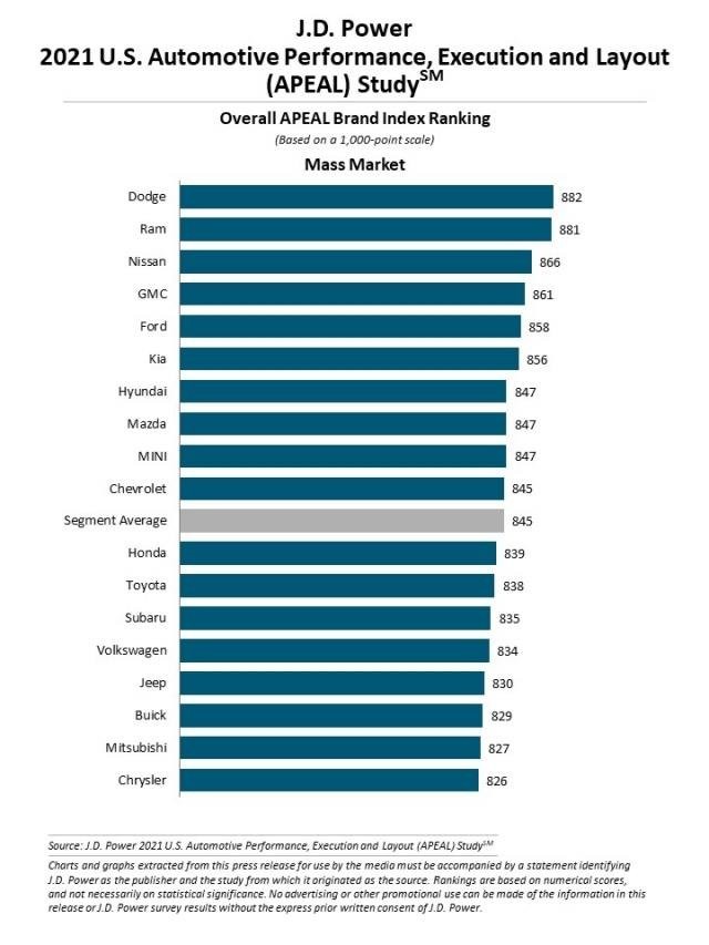 Аналітики провели опитування власників машин на предмет задоволеності моделлю і рівнем її надійності. У рамках оцінювання автовласникам пропонується 37 категорій, за якими вони повинні виставити бали. Їх підсумовують і розподіляють за шкалою від 0 до 1000, враховуючи масовість або преміальність бренду. Цього року розрив між ними становив лише 19 очок (минулого року їх розділяло 23 бали). Очолила список масових машин марка Dodge (882 бали). Друге і третє місце між собою розділили RAM і Nissan, на рахунку яких 881 і 866 очок відповідно.