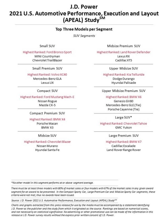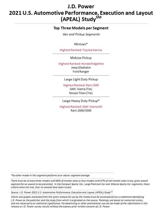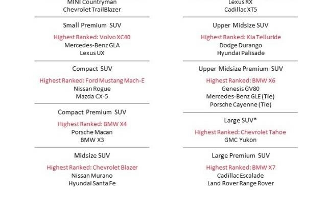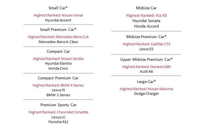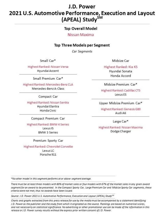 Крім визначення найкращого виробника експерти J. D. Power виділили по три моделі в кожній категорії, які набрали найбільшу кількість балів. Місце лідера серед легкових автомобілів дісталося Nissan Maxima.