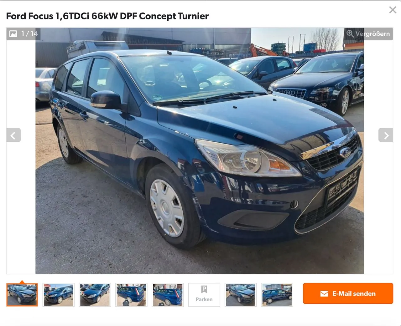 Масово потрапляють в цей діапазон ціни Ford Focus II з турбодизельним двигуном 1.6 TDCI (109 к.с.). Як і авто, що ми знайшли за 1290 Євро. Рестайловий, випуску 2009 року та цілком пристойний зовні Фокус має пробіг в 270 000 км. Хоча, якщо задатись метою зекономити на розмитненні та отримати менш дорогий в ремонті варіант, то краще звернути увагу на бензиновий 1,6-літровий варіант (100 к.с.).