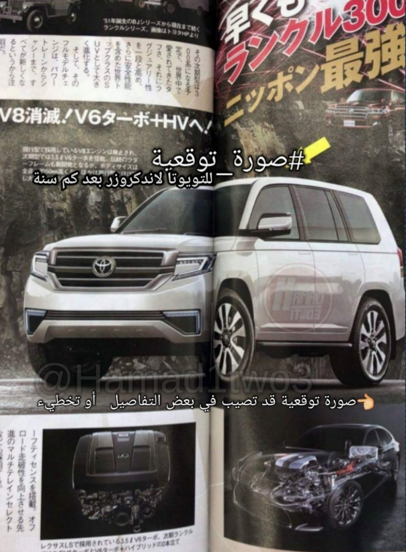 Есть также и первые характеристики Toyota Land Cruiser 200 будущего поколения – опять же, сфотографированные на страницах журнала. Указано, что габариты новинки составят 4950 х 1980 х 1920 мм, а в моторную гамму войдет 3,4-литровый V6 на 420 л.с, состыкованный с 10-скоростным автоматом. Объем багажника составит 550-750 л.
