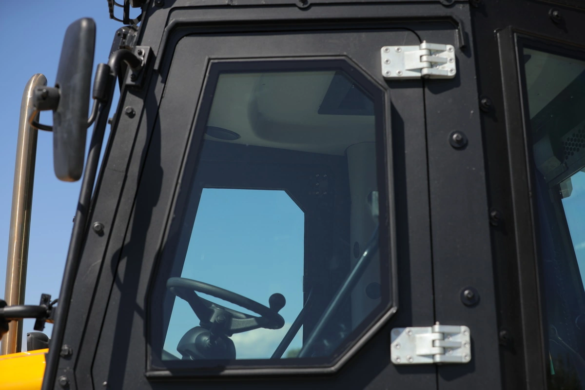 У кабіні передбачено люк для вентиляції та евакуації на випадок позаштатних ситуацій або блокування дверей, що забезпечує додатковий рівень захисту та безпеки для операторів. Також варто відзначити, що броньований навантажувач-екскаватор Reform JCB 4CX оснащений двома дверима, що є рідкісною, але дуже корисною особливістю для техніки цього класу.