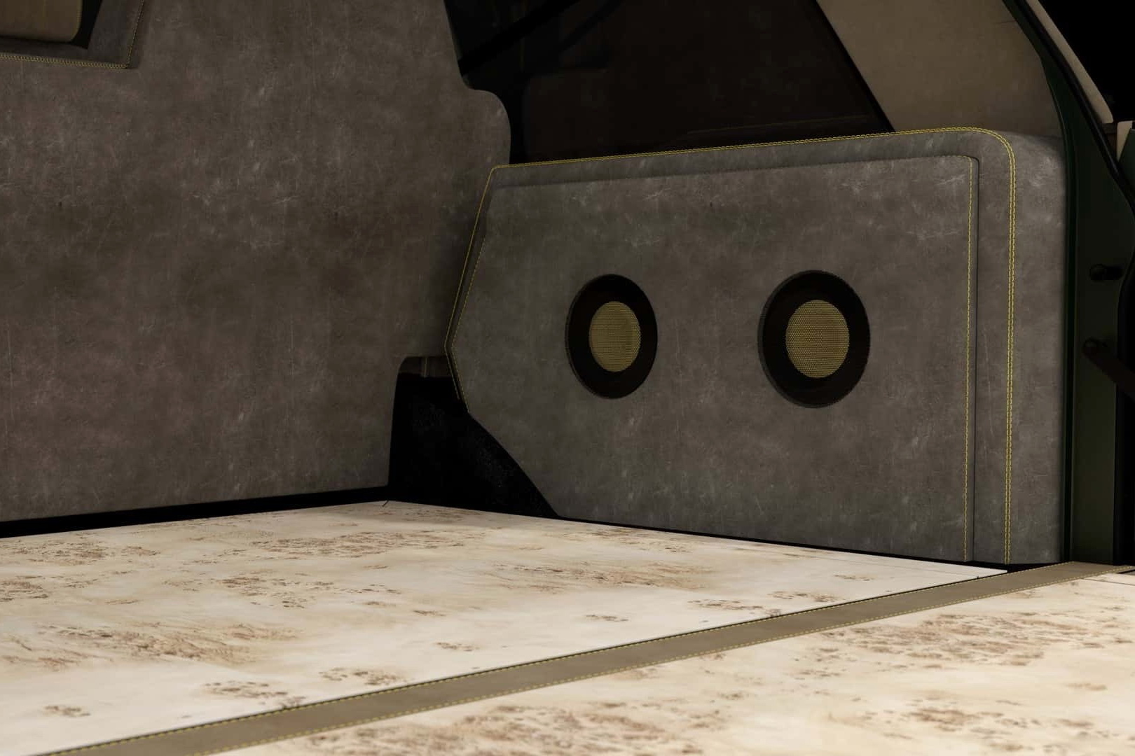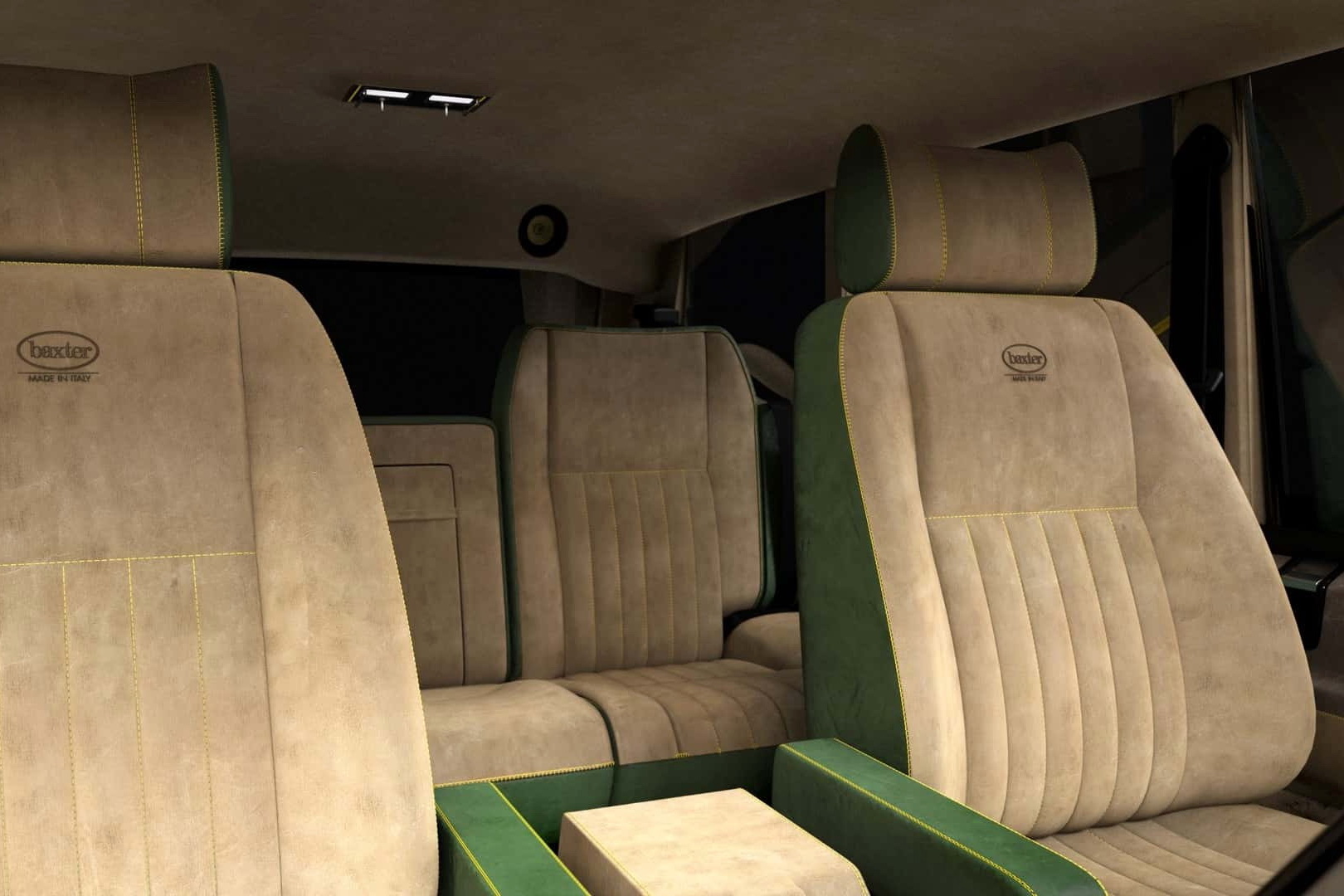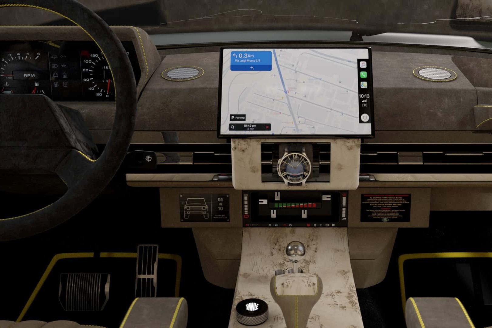 Особливу увагу автори рестомоду приділили салону. Для обробки використана шкіра Baxter двох кольорів, що покриває більшу частину салону, а особливий шарм інтер’єру надають численні елементи з кореня тополі, що зовні нагадує мармур. По центру панелі приладів встановили 10,1-дюймовий сенсорний монітор Sony, який управляє інформаційно-розважальною системою і підключений до спеціально розробленої аудіосистеми з трьома підсилювачами Rockford, десятьма динаміками та двома сабвуферами Focal. По центру торпеди розташувався годинник U-Boat Chimera.