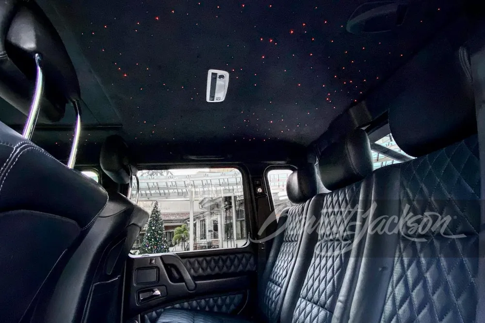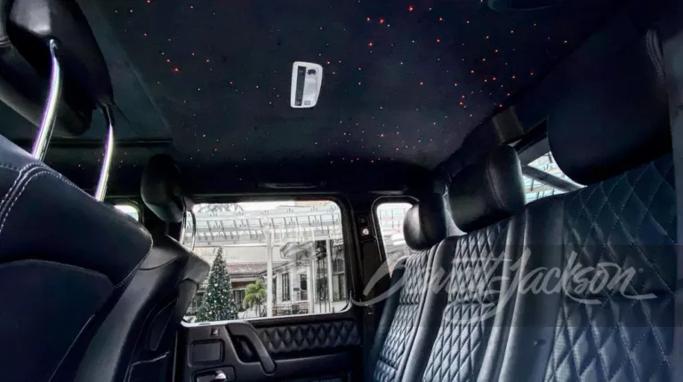 Салон позашляховика Мерседес перешитий відповідно до зовнішнього оформлення і прикрашений “зоряним небом” у стилі автомобілів Rolls-Royce. Розсипом зірок на стелі пасажири унікального Mercedes-Benz G 63 AMG зможуть милуватися, якщо пейзаж за вікном здасться їм занадто нудним.