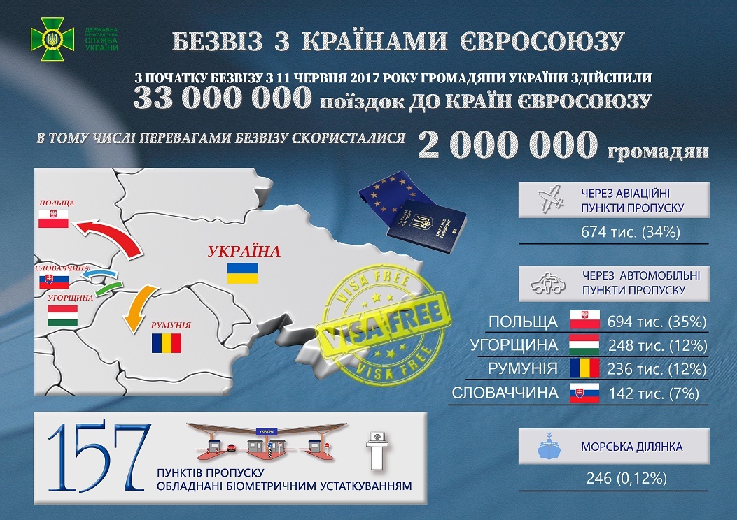 Непосредственно преимуществами безвиза по состоянию на сегодняшний день воспользовались 2 млн граждан. Автомобильные пункты пропуска пересекли 1 320 000 украинских автомобилистов.