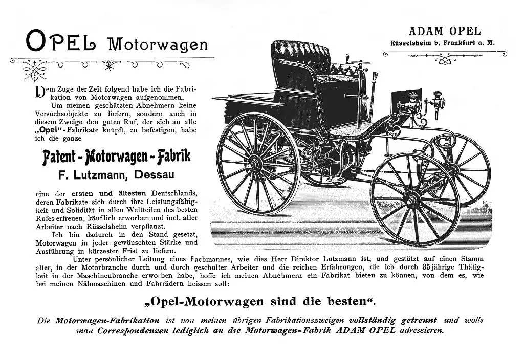 Повне придбання – виробництва та патентів – означали, що компанія Opel одразу отримала багаторічний досвід у створенні автомобілів. Відтоді Лутцманн та група співробітників відповідали за виготовлені автомобілі під Брендом Opel в окремій спеціально-зведеній будівлі. Перші рекламні оголошення про нові моделі з’явилися ще навесні 1899 року і проголосили одну просту, але дуже важливу думку: «Автомобілі Opel — найкращі».