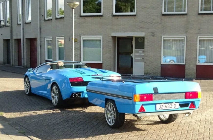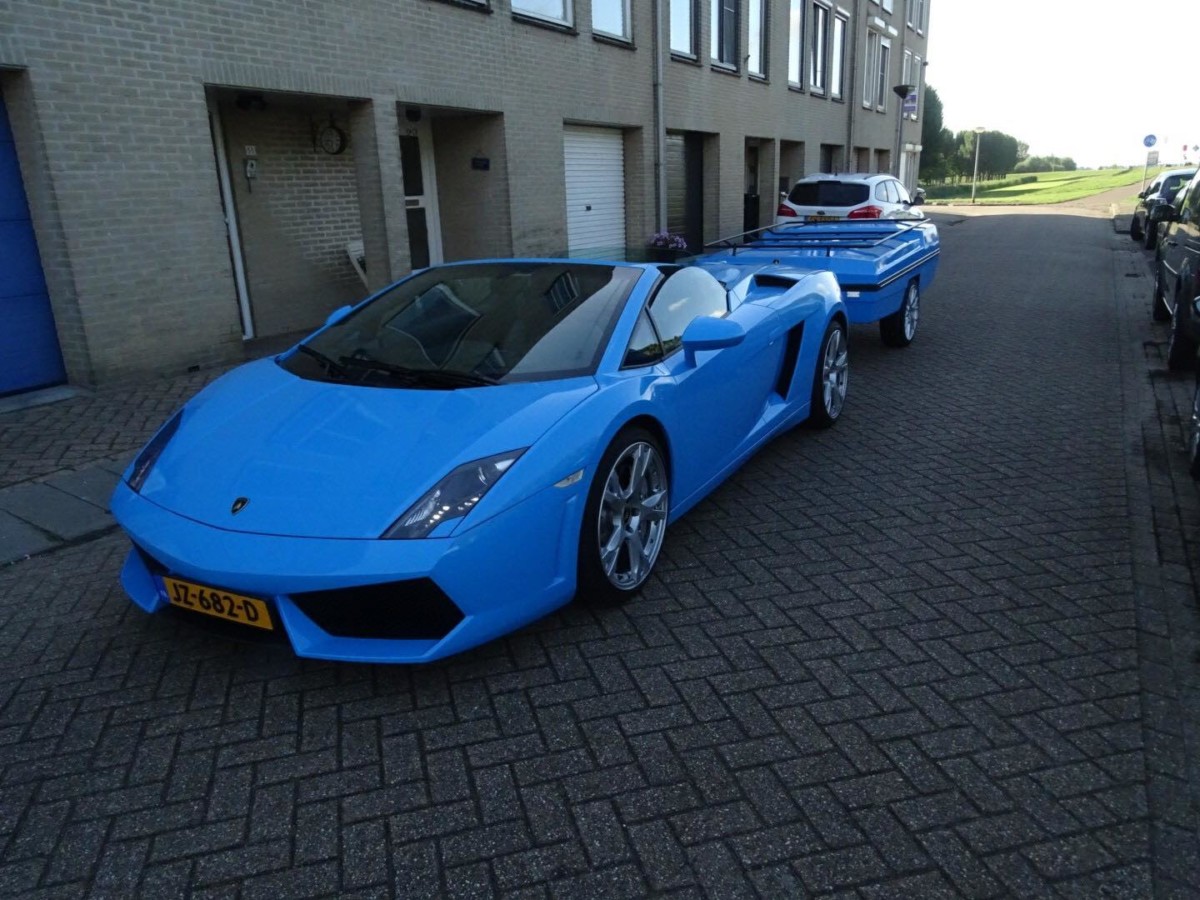А вот другой владелец Ламбо, уже из Голландии – решил проблему дальнего путешествия на суперкаре другим способом. Он просто заказал к своему Gallardo Spyder соответствующий прицеп. Последний можно легко отсоединять на стоянке и полетать по близлежащим магистралям. Правда, прицеп получился не совсем в стиле «костюмчика» Gallardo Spyder, зато оказался довольно емким.