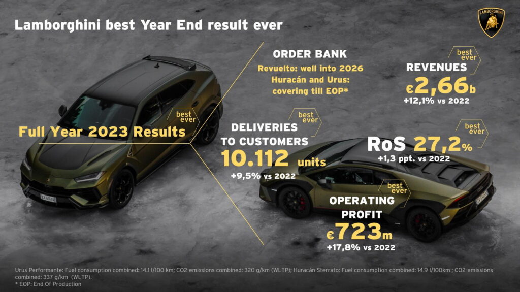 2023 рік став рекордним для Lamborghini як за кількістю продажів, так за виручкою та прибутком. Компанія вперші у своїй історії продала понад 10 тисяч автомобілів. При цьому дохід склав 2,89 млрд доларів. Це на 12,1% більше, ніж у 2022 році та більше, ніж у будь-який інший рік існування бренду. Зі слів фінансового директора Lamborghini Паоло Пома, зростання доходу дозволяє компанії збільшувати операційну маржу щорічно, починаючи з 2017 року.