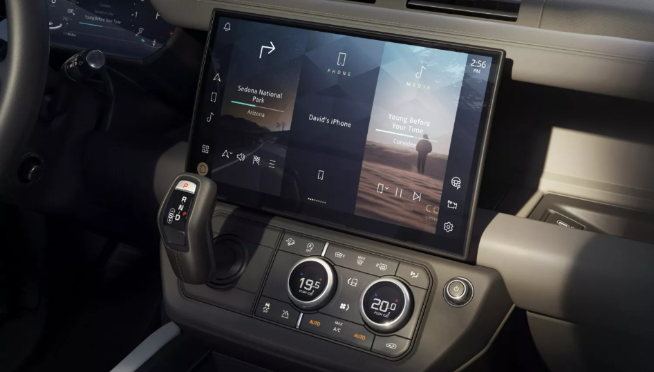 В оснащення салону оновленого Defender включили сучасну мультимедійну систему з 13,1-дюймовим екраном і збільшили секцію для зберігання дрібниць у центральній консолі. Що стосується технологій, то автомобіль отримав адаптивний позашляховий круїз-контроль, вдосконалену версію системи All Terrain Progress Control і новий Driver Attention Monitor.