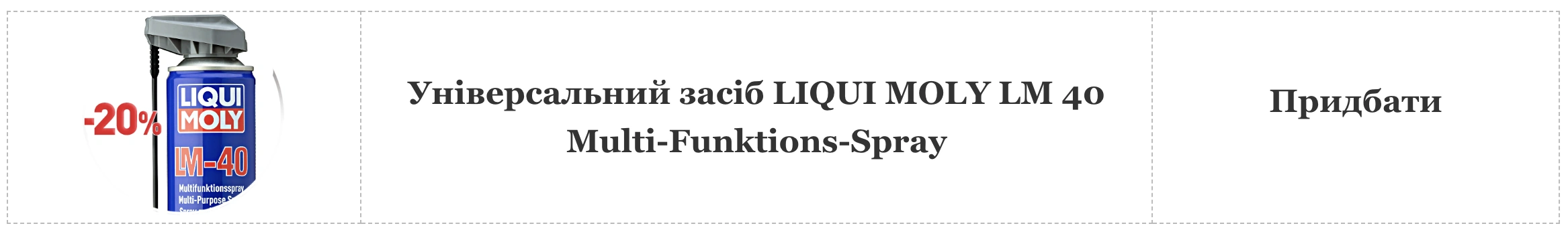 Та нарешті найголовніше, зараз у вас є можливість придбати LM-40 за вигідною ціною. Адже з 30 вересня по 27 жовтня проходить акція на універсальне мастило LM-40 для гаража, дому та дачі. В цей період LM-40 можна придбати в офіційних точках продажу продукції LIQUI MOLY зі знижкою 20%. Перелік офіційних точок можна знайти за цим посиланням.