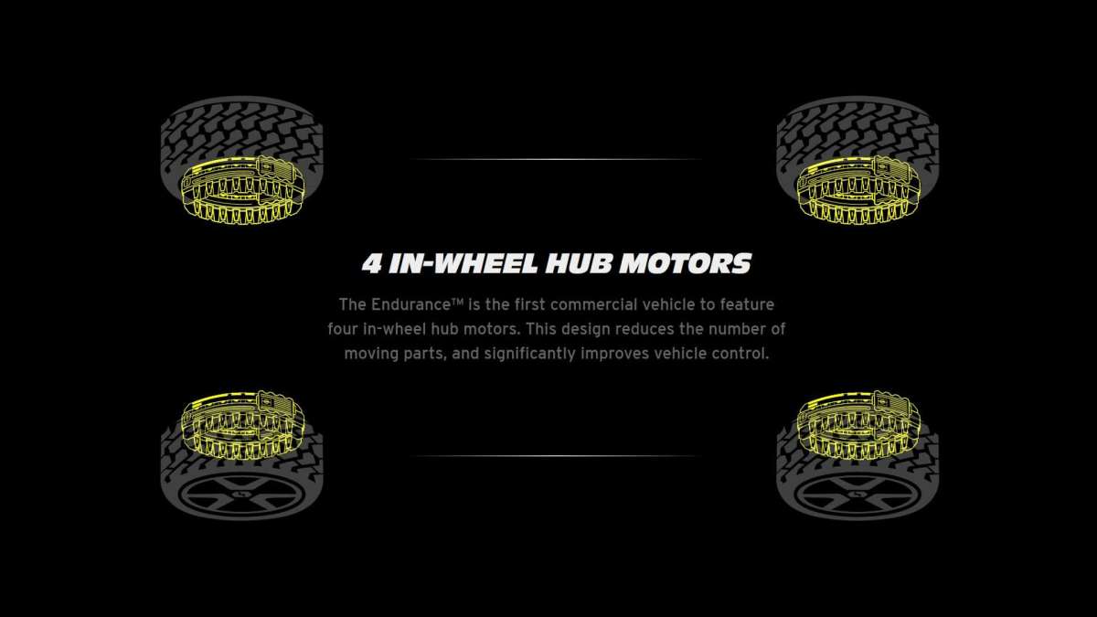 Американська стартап-компанія Lordstown Motors розкрила технічні характеристики своєї першої серійної моделі – електричного пікапа Endurance. Особливістю пікапа стали мотор-колеса. Виробники електрокарів рідко використовують подібну систему. Сукупна віддача агрегатів – близько 600 к.с. Запас ходу обіцяно на рівні 322 км за американським випробувальним циклом EPA. Якої ємності батарея його забезпечить, не уточнюється. Максимальна швидкість п’ятимісного пікапа становитиме 128 км/год, максимальна маса буксируваного вантажу – 2722 кг.