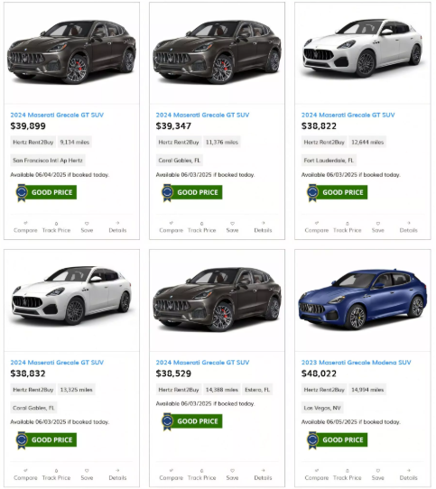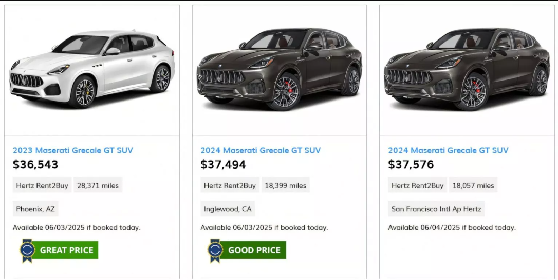 Так, сімнадцять з пропонованих Grecale оцінили менш ніж у 40 тисяч доларів. І це досить скромно, як для автомобіля такого рівня, які спочатку продавалися за 70 тисяч доларів і більше. Навіть найдорожчі комплектації кросовера продають менш ніж за 48 000 доларів. Найдоступніший Grecale на сайті Hertz — це GT 2023 року за ціною 36 543 долара.