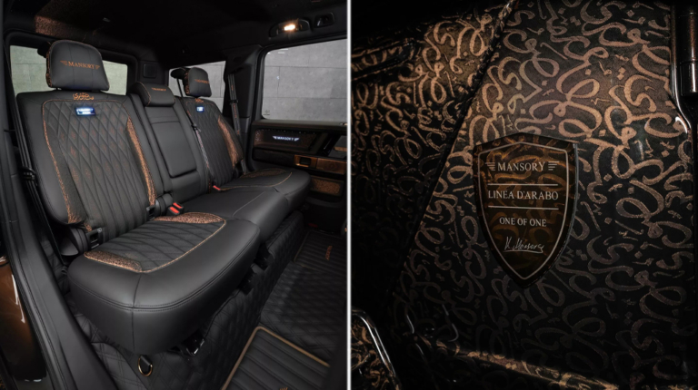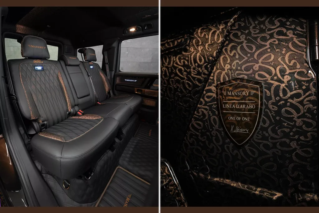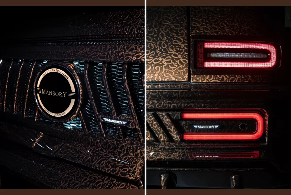 Проєкт отримав назву Mansory P820 Linea D’Arabo, а за основу його створення взяв модернізований G-Class. Позашляховик пофарбований в насичений коричневий колір з хитромудрим арабським орнаментом по всьому кузову. Більшість оригінальних деталей Mercedes-Benz були замінені новим обважуванням від Mansory, включаючи встановлення задніх дверей, що відкриваються проти ходу. Він включає ексклюзивну передню панель з агресивним бампером, на якому закріплені три вертикальних денних ходових вогнів з кожного боку. Також з’явилися радикально нові решітки радіатора, модифіковані фари та великий логотип Mansory, що гордо розташований по центру решітки, хоча і без цього елемента навряд чи у когось виникнуть питання щодо авторства проєкту.