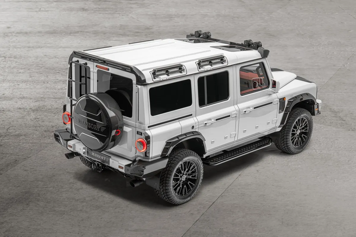 Позашляховик отримав карбоновий повітрозабірник на капоті, широкі карбонові колісні арки, фірмовий кожух запасного колеса із символікою Mansory, додаткові карбонові елементи на задніх крилах та бамперах. Всі ці доробки виглядають гармонійно, а карбонові елементи доповнюють зовнішній вигляд. Також новинка отримала 20-дюймові диски FV.9 з шинами розмірністю 305/50 R20 XL. Нові пружини дозволили збільшити кліренс на 20 мм.