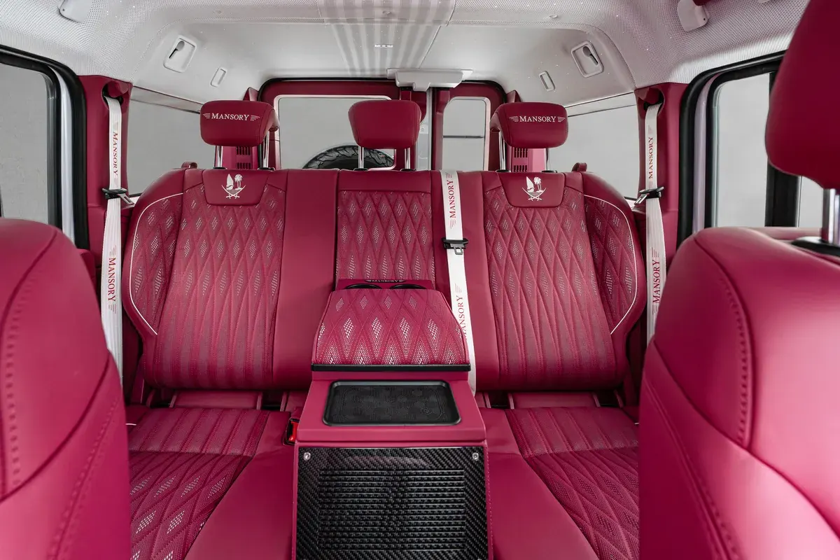 Усередині Ineos Grenadier від Mansory отримав розкішне комбіноване оздоблення з бордової та білої шкіри. Передні крісла оснащені електроприводами, підігрівом та вентиляцією, у консолі між сидіннями встановили невеликий холодильник. Ззаду встановлена центральна консоль також із вбудованим холодильником та індукційною зарядкою, а сидіння мають функцію вентиляції та інший кут нахилу спинки сидіння для підвищення комфорту.