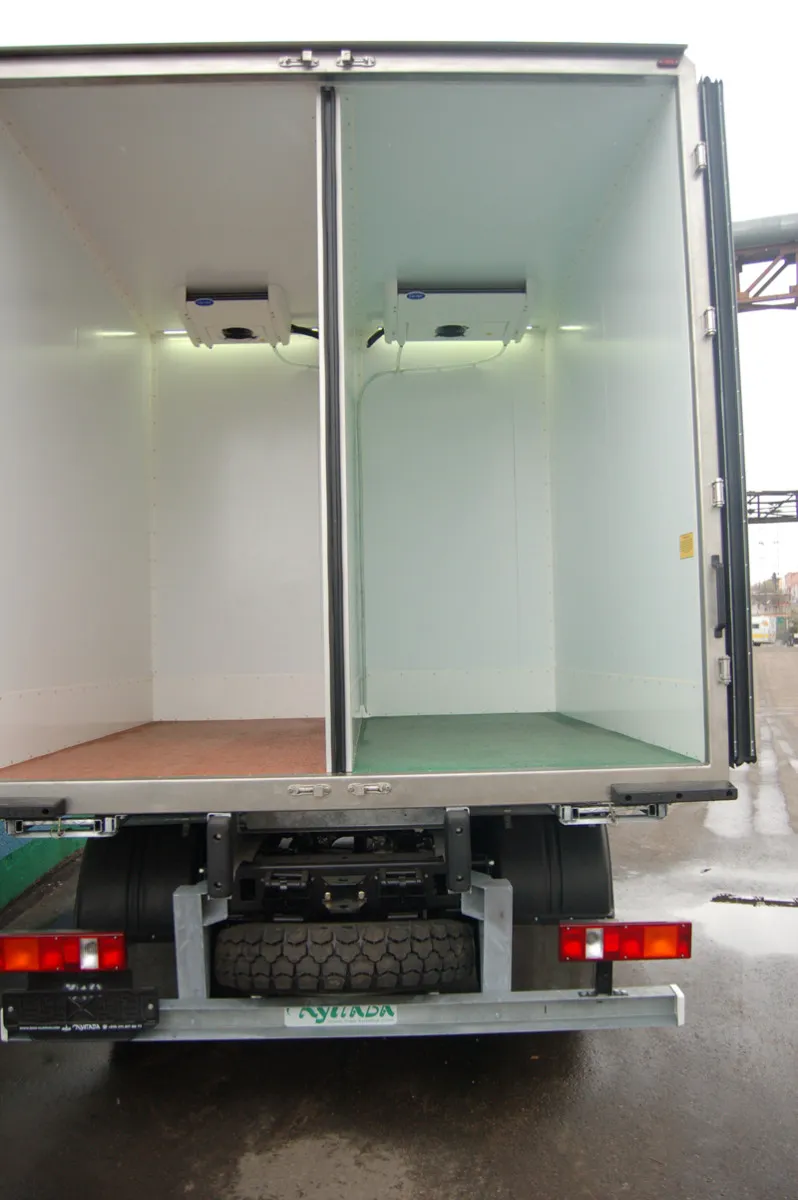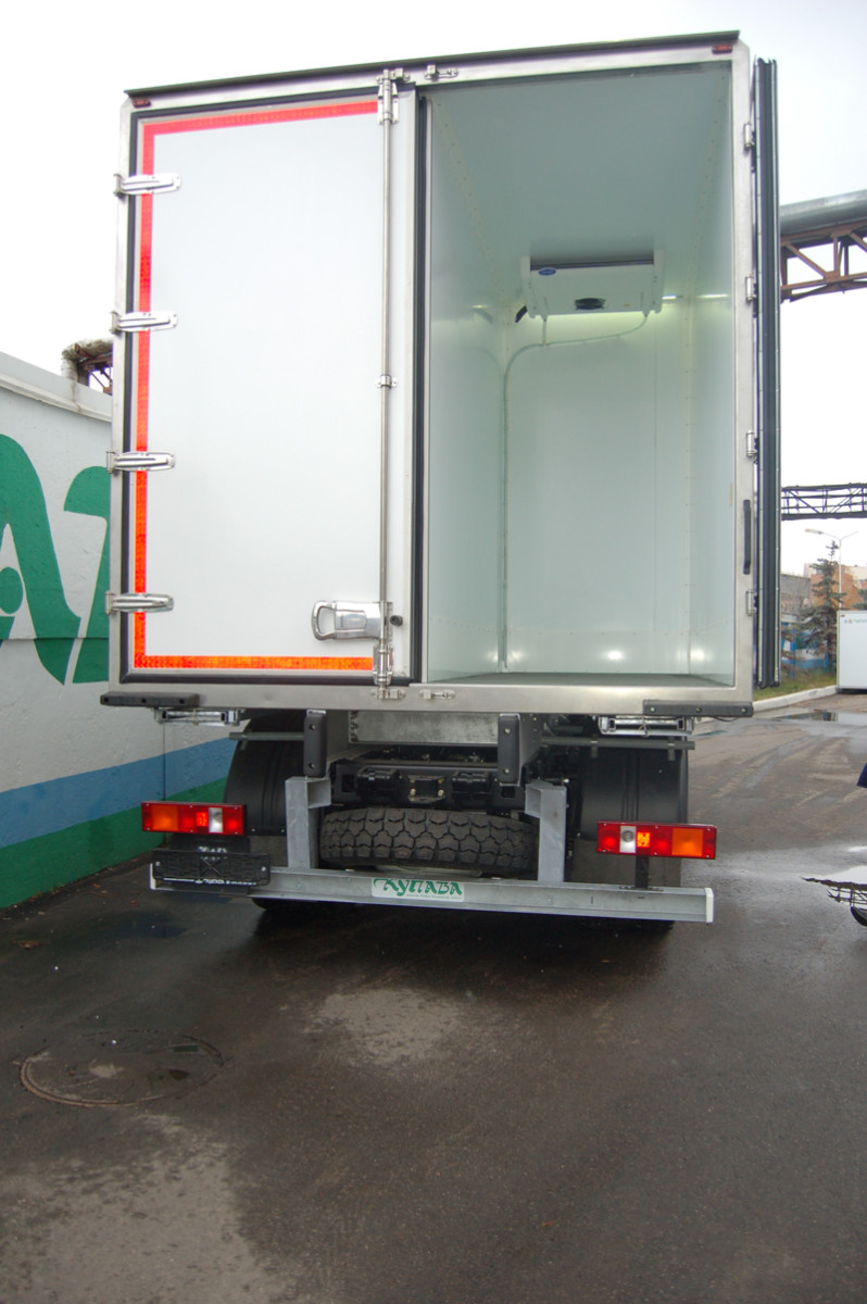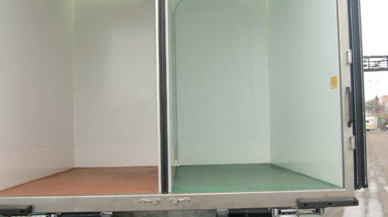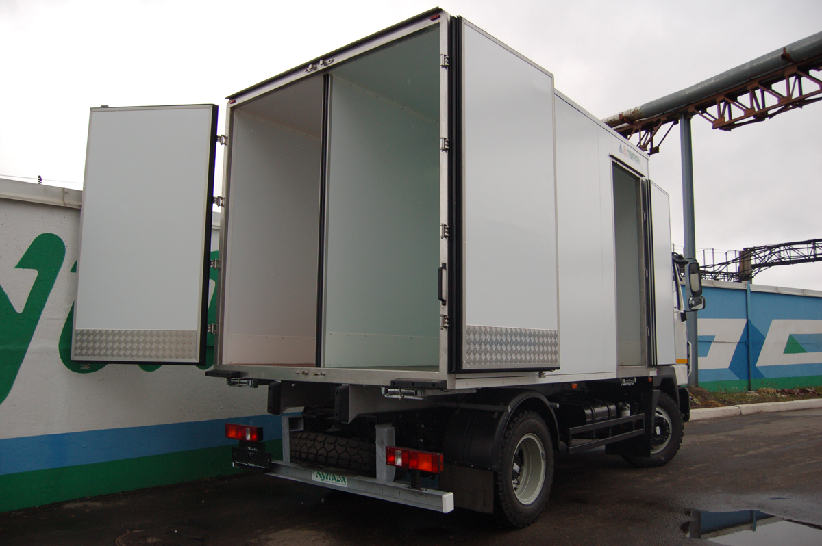 Бічні стінки кузова, так само, як і підлога, а також дах зроблені за принципом сендвіч-панелей. Важливо, що вони покриті оцинкованою сталлю. Задні двостулкові двері відчиняються на кут до 270 градусів і мають надійні фіксатори. Підлога фургона має поліуретанове покриття, яке має різне колірне рішення в кожному з відсіків.