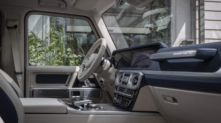 Салон оздоблено чорною шкірою наппа і вставками з чорного ясена. Знову ж таки, для замовлення доступні різні варіанти інтер’єрів, наприклад Exclusive Interior Plus з синьою або червоною шкірою на вибір, зі спеціально підібраними вставками з дерева або чорного рояльного лаку. Але незалежно від обраних пакетів оснащення, всі спеціальні версії Mercedes-Benz G-Class Stronger than Time можуть похвалитися панорамним дахом, контурним освітленням, мультиконтурними сидіннями і аудіосистемою Burmister. І це тільки мала частина списку опцій люксового позашляховика!