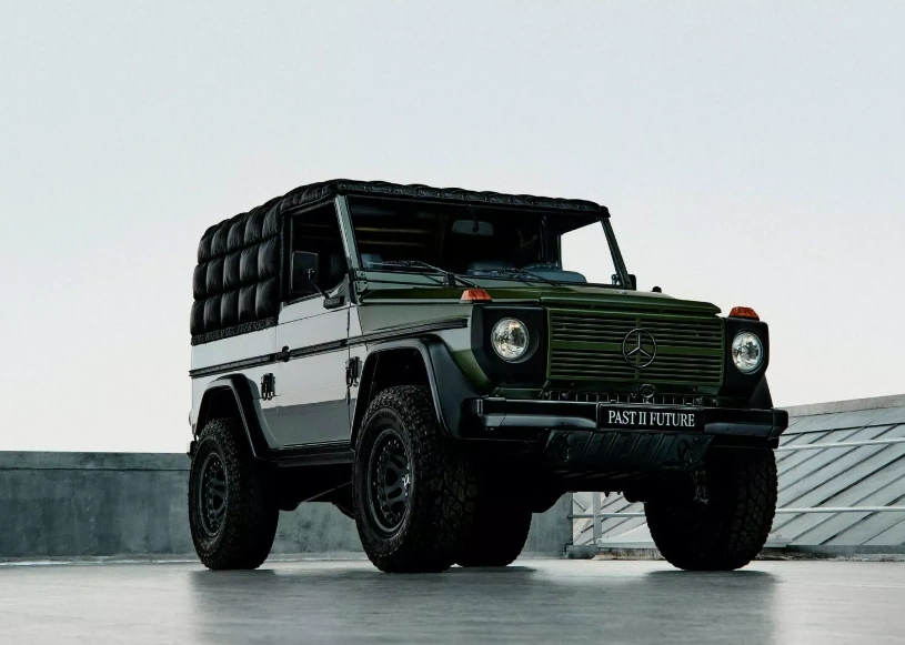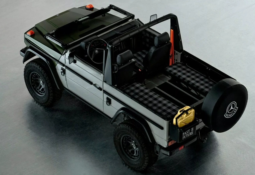 Спеціальна версія культового позашляховика отримала приставку «Past II Future» в назві і виглядає просто приголомшливо. Її стилізували під пухову куртку, якими славиться Moncler. За основу для цієї моделі взяли класичний кабріолет з 90-х років і внесли низку змін. G-Class отримав пофарбований у сірий та оливково-зелений матовий відтінки кузов, до яких приєднуються чорні та золоті акценти. Але особливий штрих, це знімний дах, обробка якого відстрочена як пуховик.