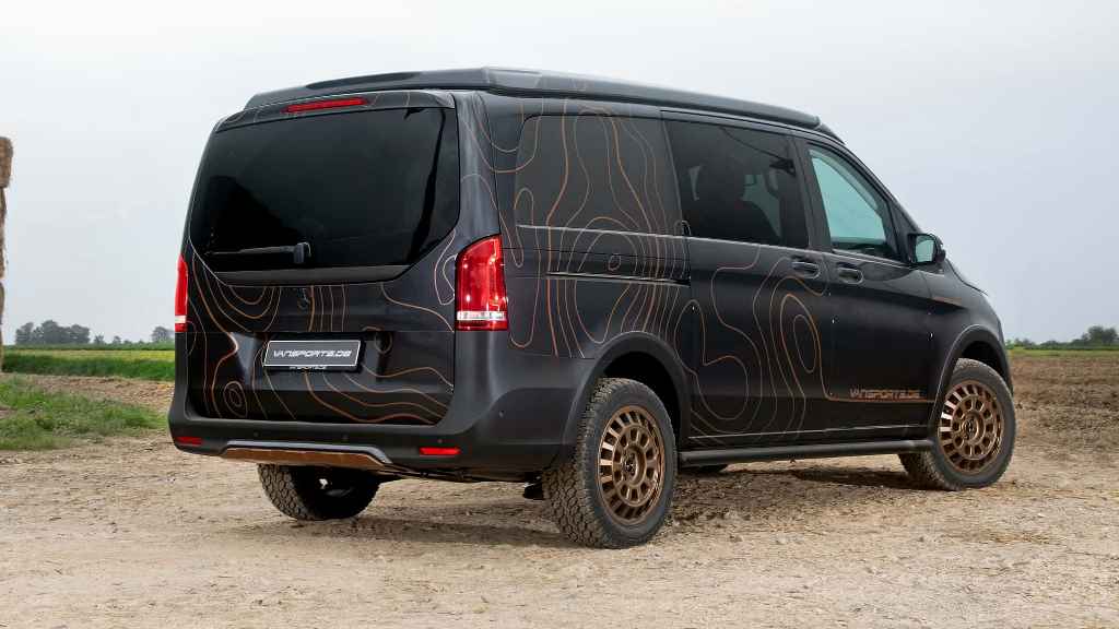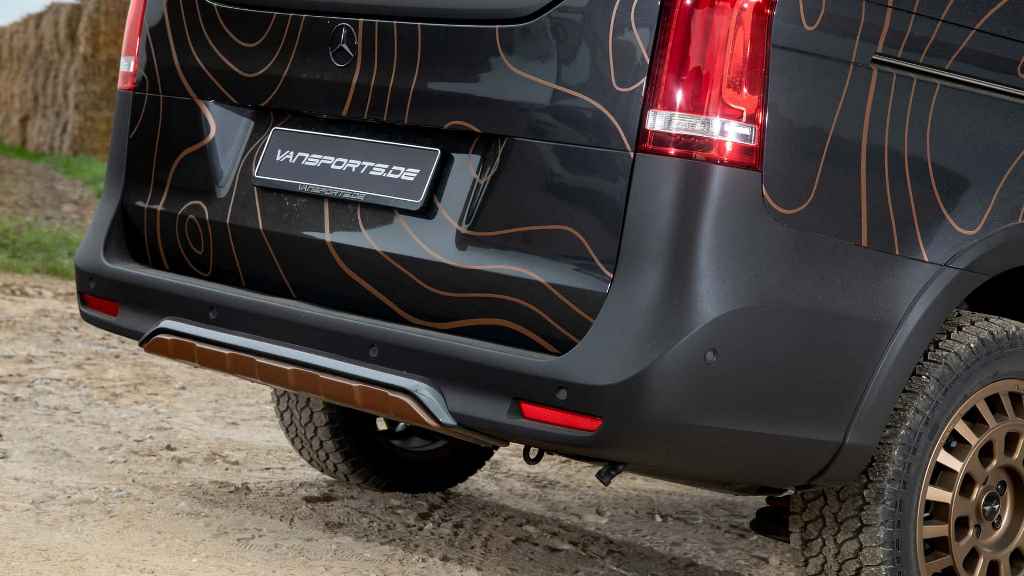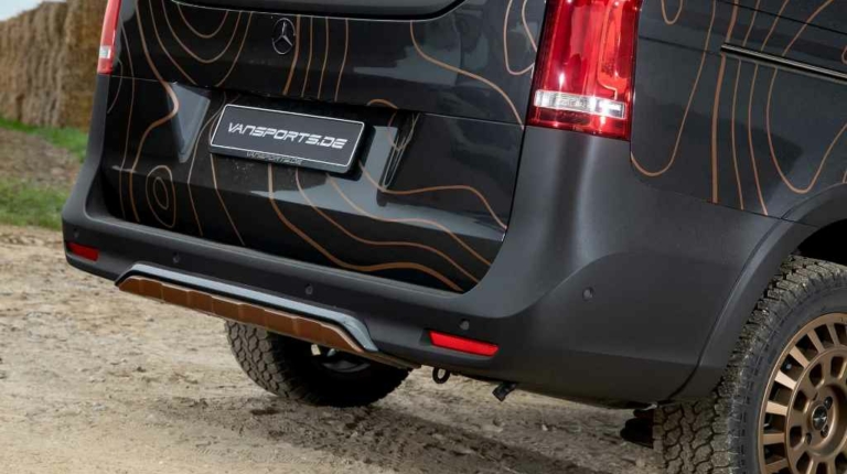 На мінівен встановили передній бампер VP Gravity і розширені крила, що надало йому більш грізного вигляду. Пофарбували Mercedes-Benz у чорний колір із золотими акцентами у вигляді топографічної карти, яку доповнюють стильні 18-дюймові колісні диски бронзового відтінку. Завершує образ збільшений на 52 мм дорожній просвіт.