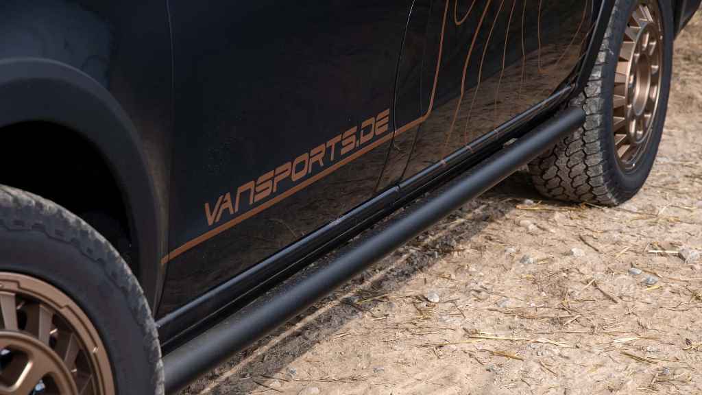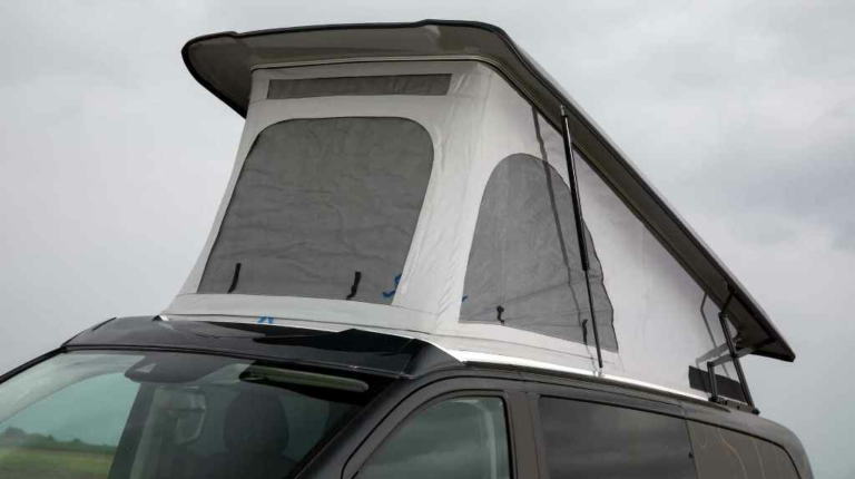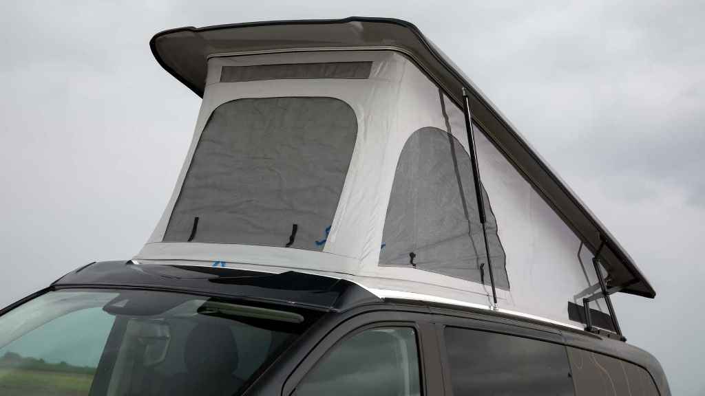 На даху цього мінівена встановили розкладний намет, в якому облаштовано спальне місце для двох людей. Ще в одне двоспальне ліжко перетворюються сидіння в салоні. Також тут є невелика кухня з варильною поверхнею, раковиною, холодильником, розкладним столом. Передбачений і виносний душ.