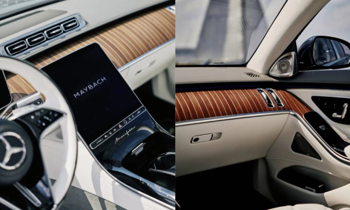 Флагманський Mercedes-Maybach S680 отримав двоколірний кузов – верхня частина забарвлена у синій відтінок Nautical Blue Metallic, а нижня – у бордовий Patagonia Red. Один від одного вони відокремлені тонкою білою смужкою Opalite White Metallic.