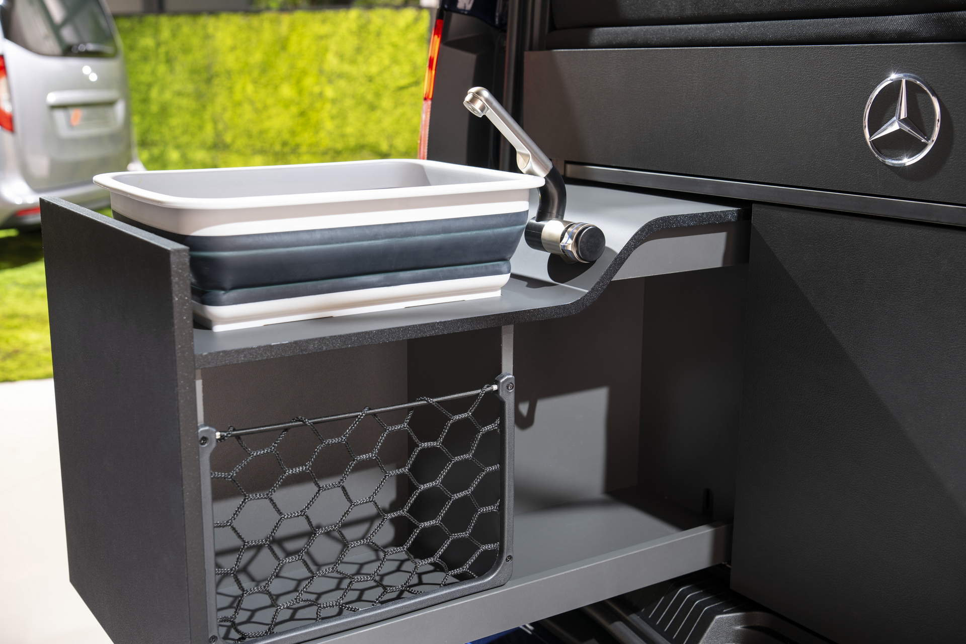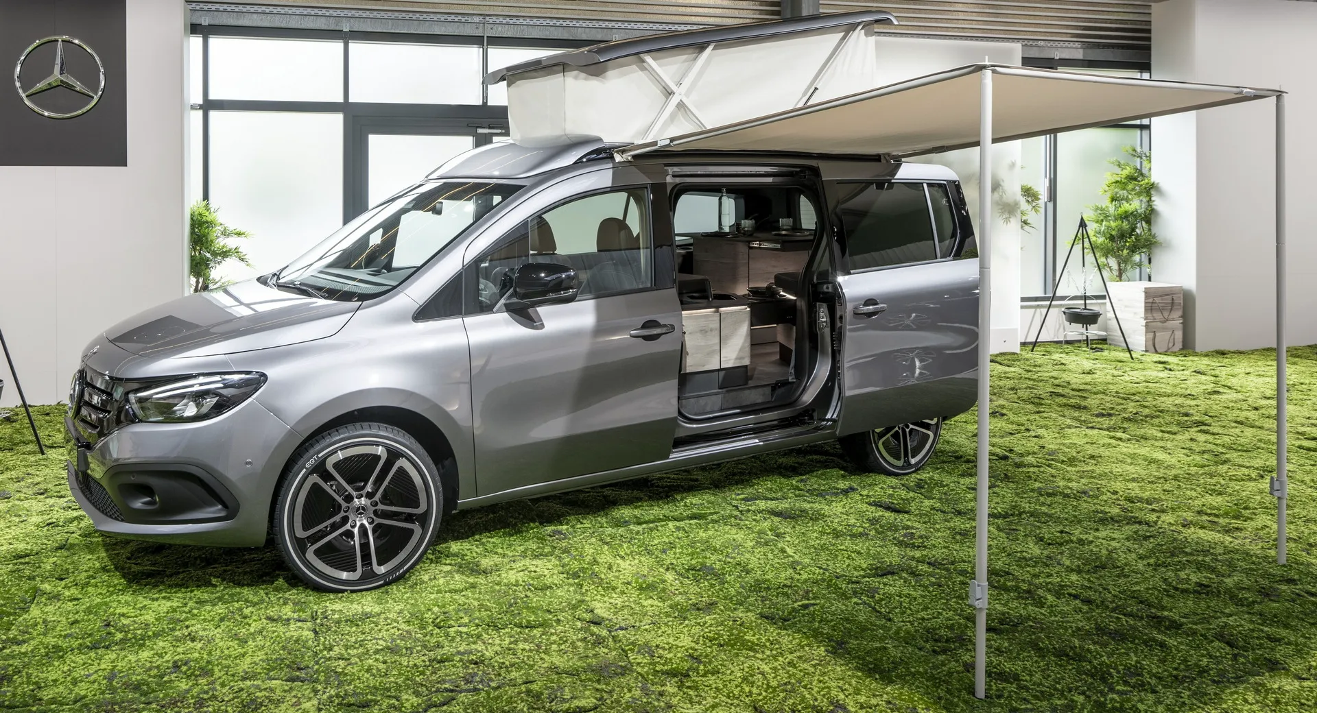 Що стосується кемпінгу з приставкою Marco Polo1, то він комплектується складним наметом, інтегрованим у дах. Також в обладнання увійшла пральна машина, невеликий 16-літровий холодильник, ящики для зберігання дрібниць, газова плита, мийка, розкладний стіл та стільці.