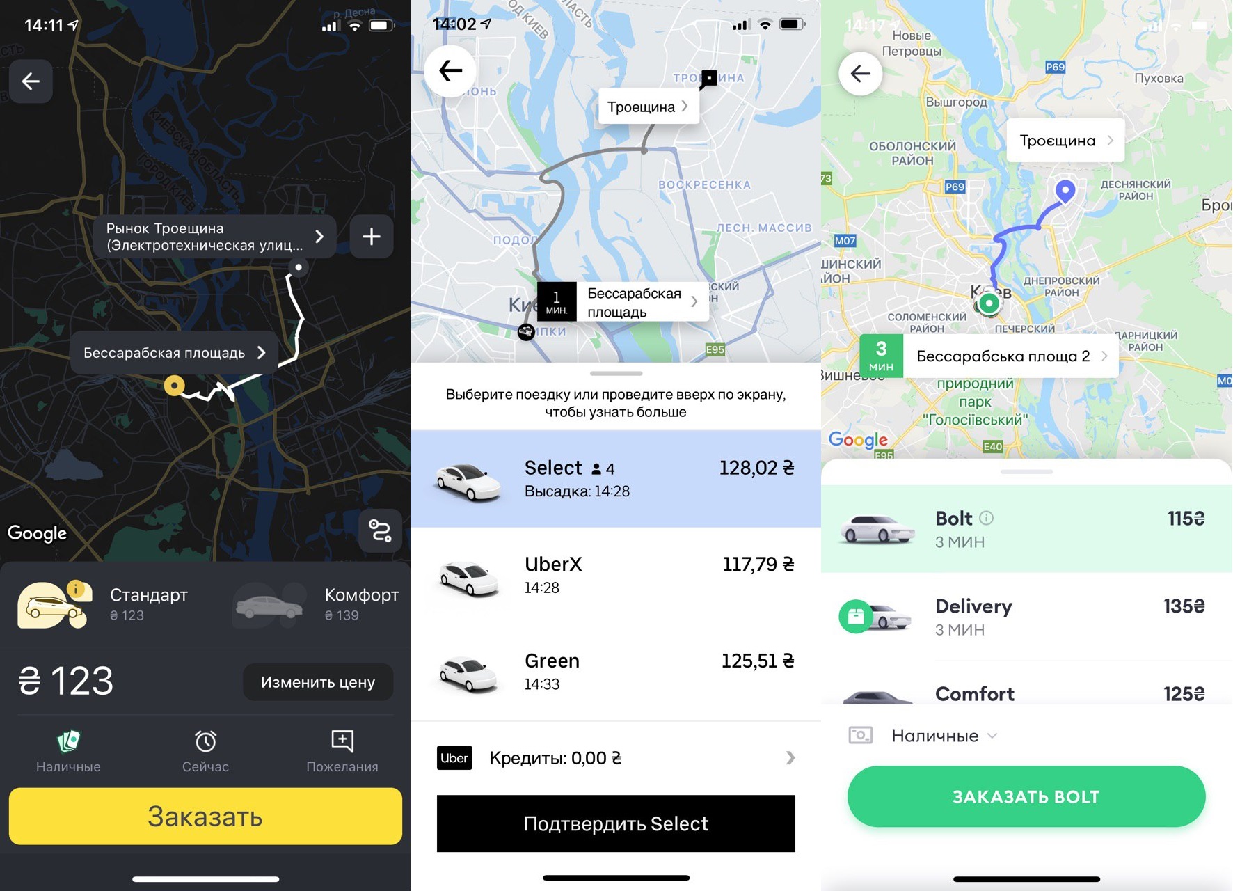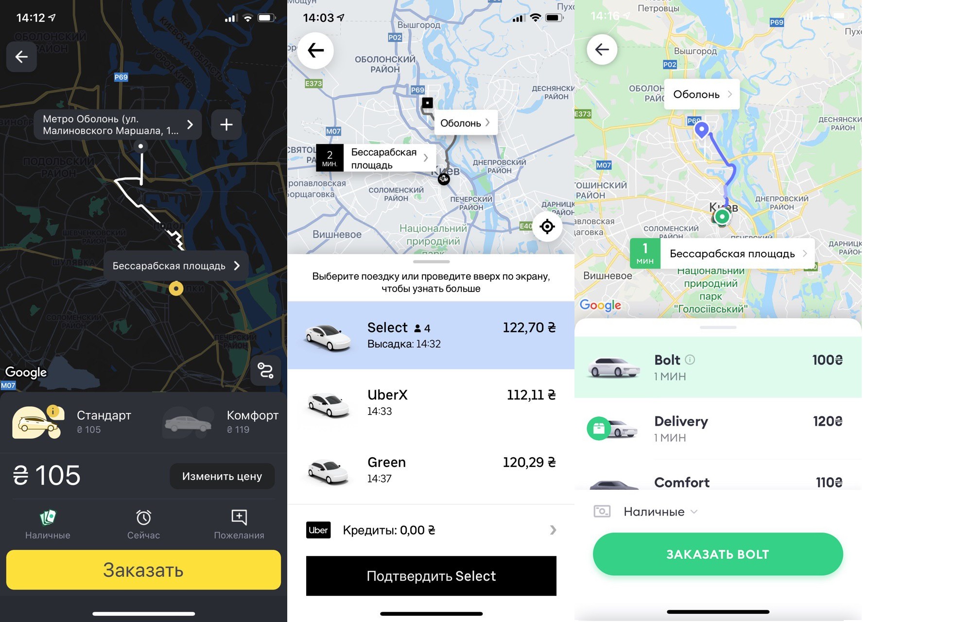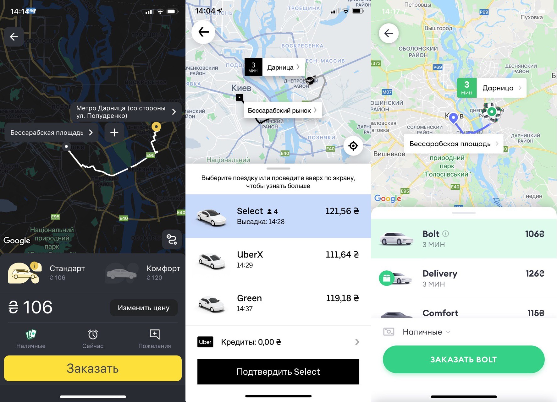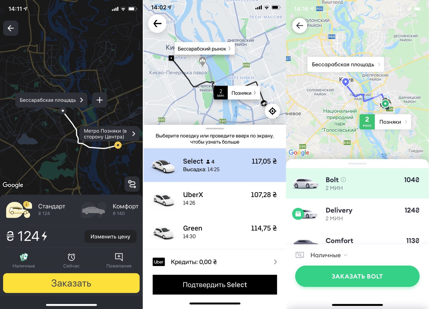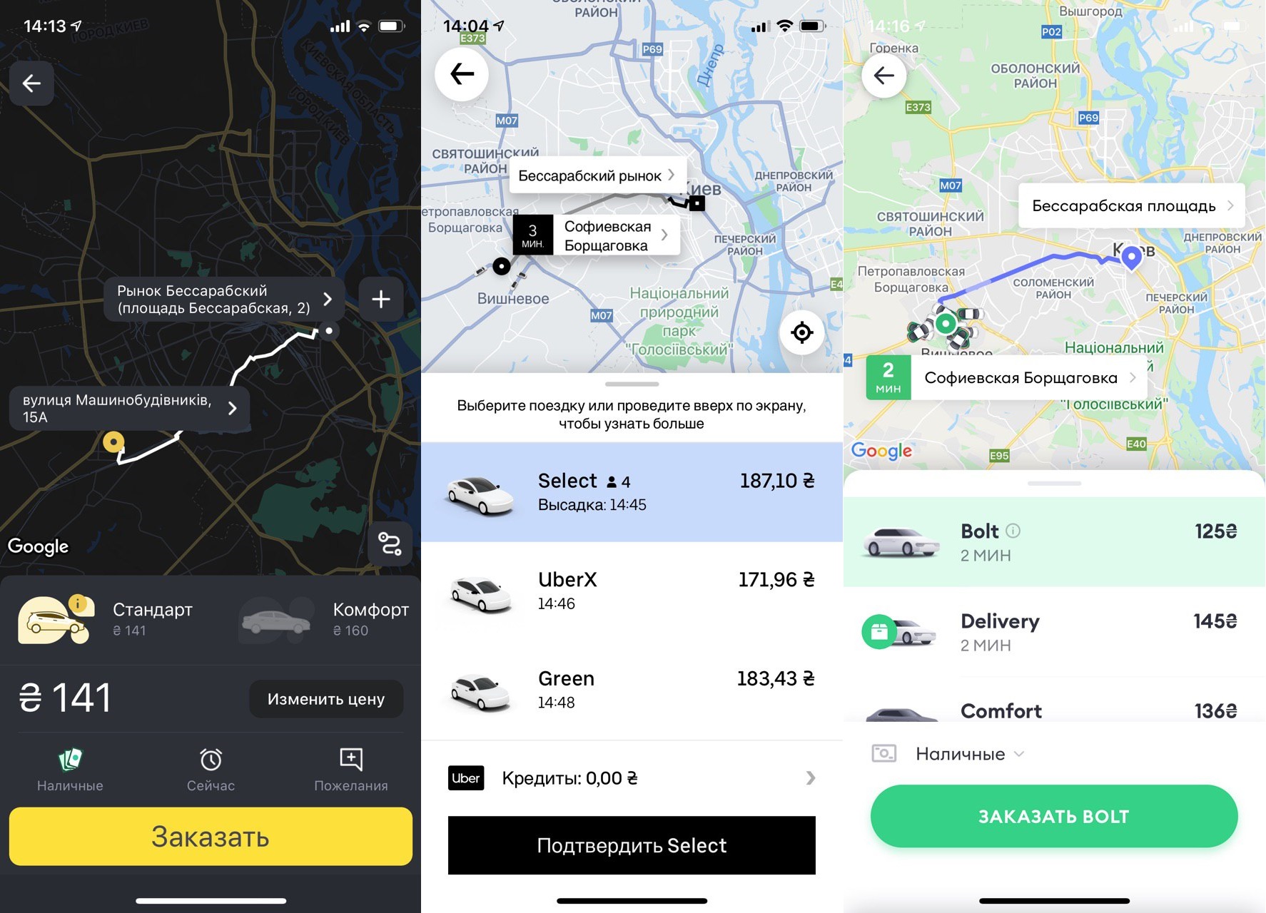 Здавалося б, така ситуація мала моментально підняти коефіцієнт вартості на послуги таксі, однак, як не дивно, ціни залишилися звичайними. Ми порівняли, у скільки обійдеться зараз поїздка у деякі напрямки Києва і дійшли висновку, що серед всіх популярних сервісів для замовлення таксі, таких як Uber, Uklon і Bolt, ціни поки залишаються колишніми.