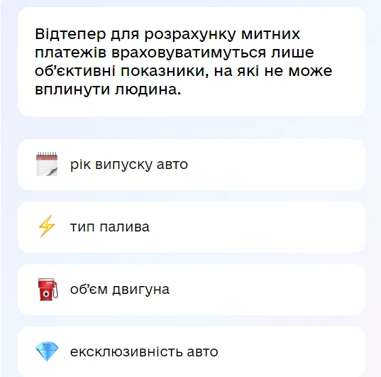 У новій формулі розмитнення авто враховуватимуть лише об'єктивні показники, на які не може вплинути людина. Це зроблено для того, щоб мінімізувати корупційну складову. Серед них: рік випуску машини, вид палива, об'єм двигуна та ексклюзивність транспортного засобу. У відомстві зазначили, що процедура буде максимально простою та зрозумілою.