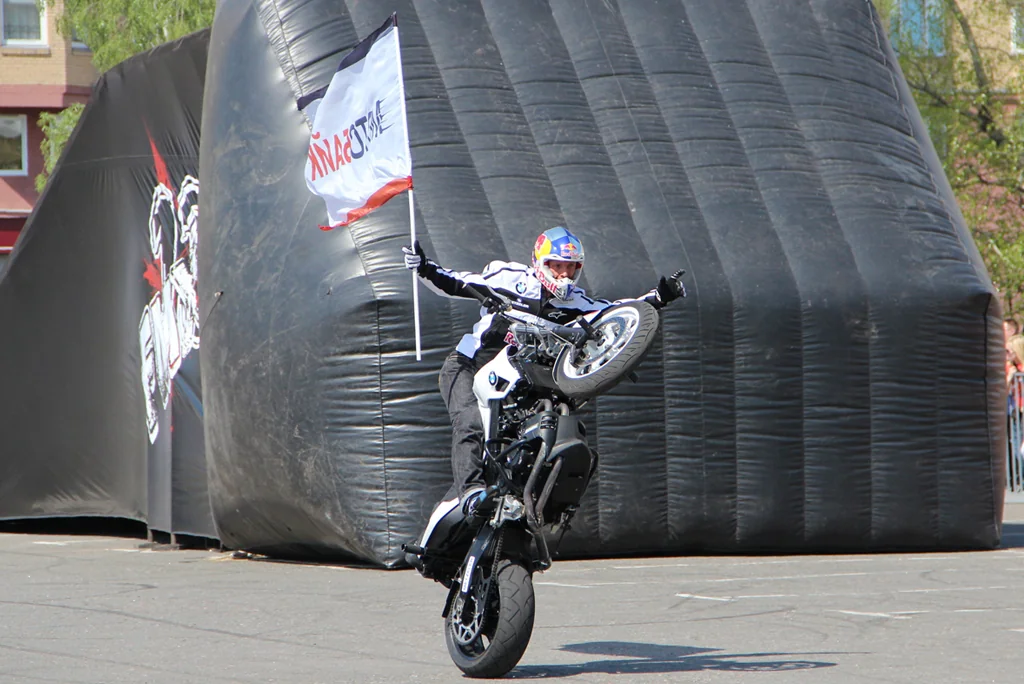 Езда на заднем колесе по кругу без помощи рук, развороты на месте, езда на заднем колесе, стоя на баке или сидя на руле, эффектные стоппи (езда на переднем колесе при томожении) - далеко не полный список того, что смогли увидеть киевляне в рамках уникального визита аса двухколесной техники на выставку мотоциклов в Украине.