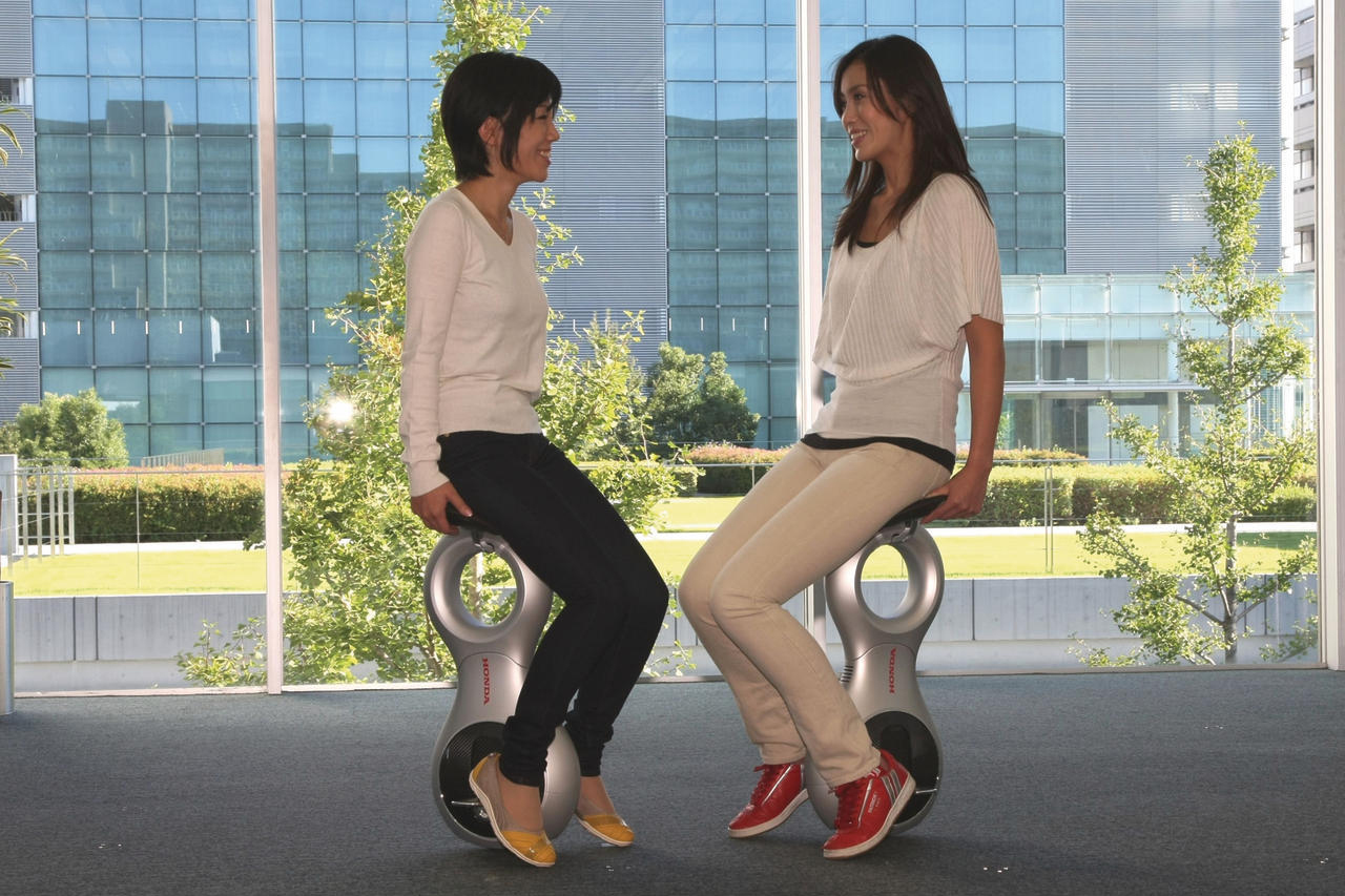 Десятикилограммовый чемоданчик, напоминающий восьмерку, после активации трансформируется в своеобразный табурет высотой 65 см, стоящий на единственном колесе и сохраняющий равновесие посредством гироскопа, как известный и уже ставший популярным Segway. Но на этом сходства этих двух транспортных средств заканчиваются. Электрический моноцикл Honda U3-X намного легче, не имеет каких-либо органов управления, на нем можно сидеть, как на стульчике. Но самое необычное – концепт позволяет двигаться в любом направлении, лежащем в поперечной плоскости, без поворота. Достаточно сместить центр тяжести в любую сторону.
