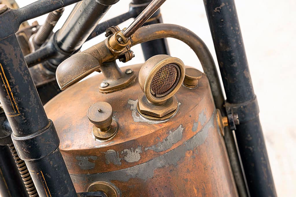Конструкція цього мотоцикла дуже цікава. Його бензиновий мотор не мав карбюратора, який на той час ще розробляли. Тому змішування палива з повітрям відбувалося просто в бензобаку, при його струшуванні під час їзди. Далі отримана робоча суміш надходила спеціальною трубкою безпосередньо в циліндри. До речі, бак для системи водяного охолодження було виготовлено у формі заднього крила.