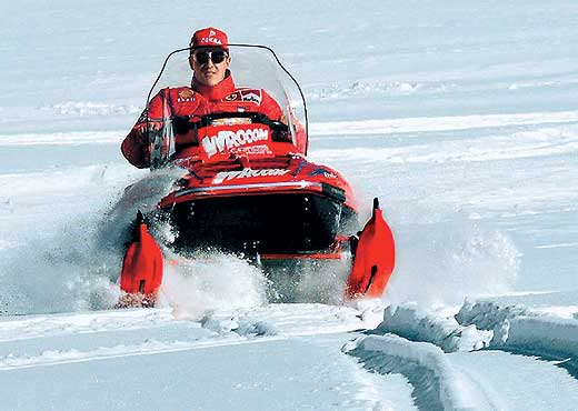 Следующий прием – прыжки. Начинать нужно с такой скорости, чтобы машина только «облизывала» трамплин, но не прыгала с него. И помните, что завалить снегоход набок – секундное дело: достаточно в полете переместить корпус вправо или влево. Прыгать нужно строго перпендикулярно трамплину. А если почувствовали, что машина «пошла винтом», немедленно катапультируйтесь – целее будете. Чтобы приземлять аппарат на гусеницу, нужно в начальной фазе полета максимально сместиться назад. А если «в полете» не закрывать дроссель, то во время приземления снегоцикл выстрелит так, что дальше прыгать вы будете уже без него.