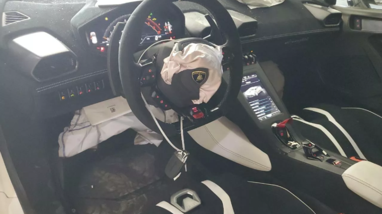 У Huracan внаслідок лобового зіткнення сильно пошкоджено передню частину. Передній бампер розбитий, а спліттер зовсім відсутній. Карбоновий капот весь у тріщинах, пошкоджено крило з боку пасажира та розбито вітрове скло. У салоні цього суперкара спрацювали всі подушки безпеки від сили удару.