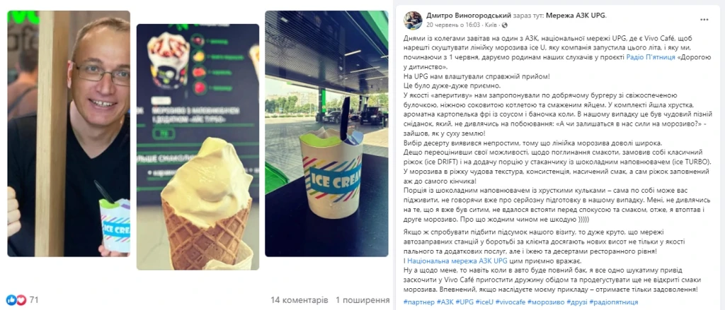 і те, що з арахісом. І оте з шоколадом. І з полуницею. І, коротше, усе… Самі АЗК UPG – це естетичне задоволення. Круто, що наші зуміли оце все – і функціонально, і красиво, і смачно, і привітно. Радію і як жінка, і як мама, і як водій, і як патріот. Круте морозиво, круті UPG, крута Україна!», – написала ведуча «Авторадіо» Катерина Соловйова у Facebook.