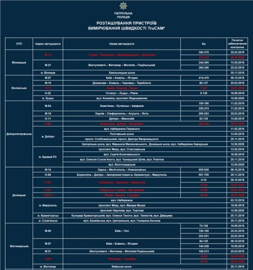 А загалом на дорогах України працюватиме 116 приладів TruCAM, а вимірювання здійснюватимуться на 252 ділянках. Нові пристрої з'являться в таких областях: Вінницька, Волинська, Дніпропетровська, Донецька, Житомирська, Закарпатська, Запорізька, Івано-Франківська, Київська, Кіровоградська, Луганська, Львівська, Миколаївська, Одеська, Полтавська, Рівненська, Сумська, Тернопільська, Херсонська, Харківська, Хмельницька, Черкаська та Чернігівська. Всі нові ділянки відзначені на карті червоним кольором, а вже наявні — синім.