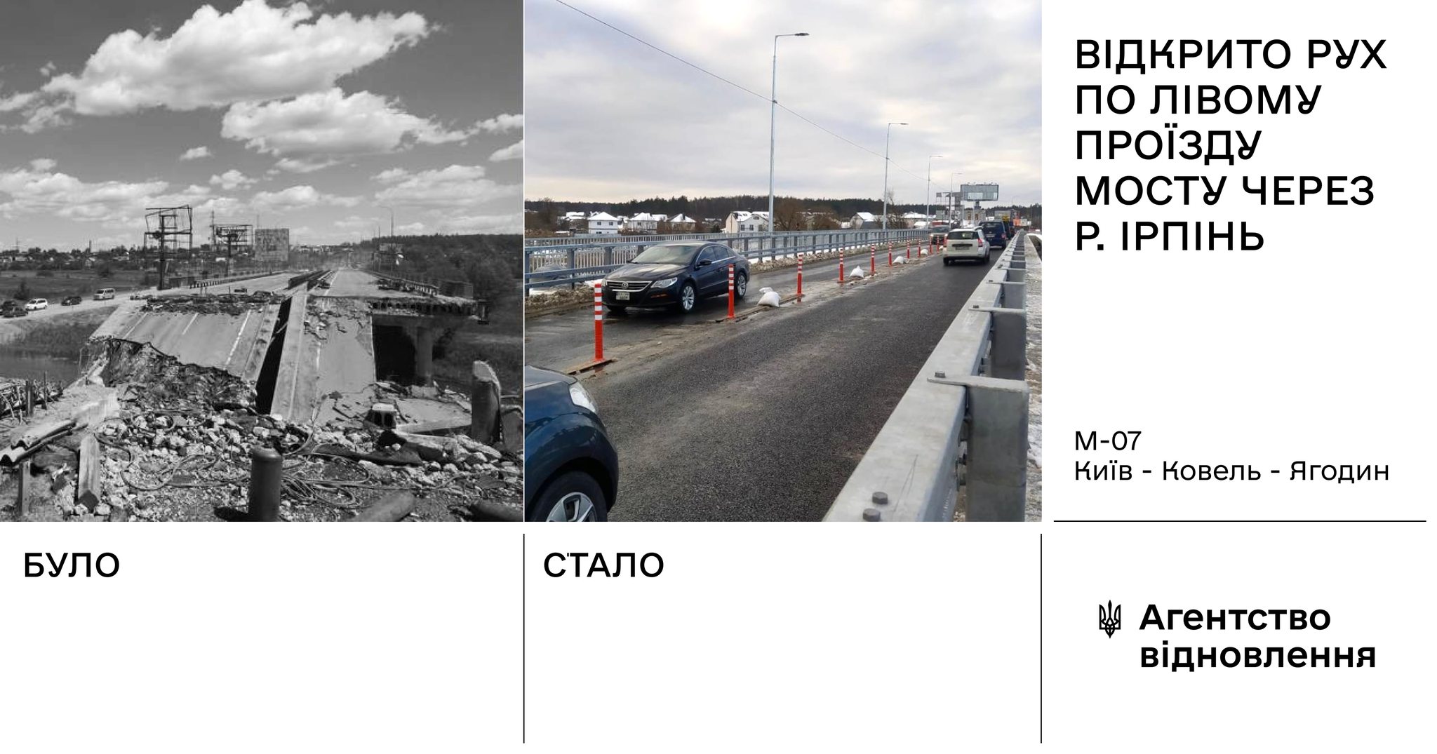 Як повідомили у пресслужбі Державного агентства відновлення, наразі рух транспорту дозволено лише по лівій частині. Проїзд тимчасово здійснюється в обох напрямках – у бік Києва та Гостомелю. Правий проїзд планують відкрити наприкінці січня, коли завершать роботи з водовідведення.