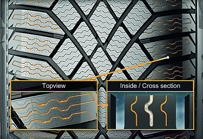 Для повышения жесткости блоков протектора (от чего зависят реакции на повороты руля и устойчивость в поворотах) они соединены небольшими перемычками. На льду и снегу в работу вступают 3D-ламели, которые формируют огромное количество граней, цепляющихся за поверхность. 3D-ламели с разной шириной прорезей формируют карманы для накопления снега, который, контактируя со снегом на дороге на уровне кристаллов, повышает сцепные свойства шины с поверхностью покрытия, снижая тормозной путь и улучшая тяговые характеристики.