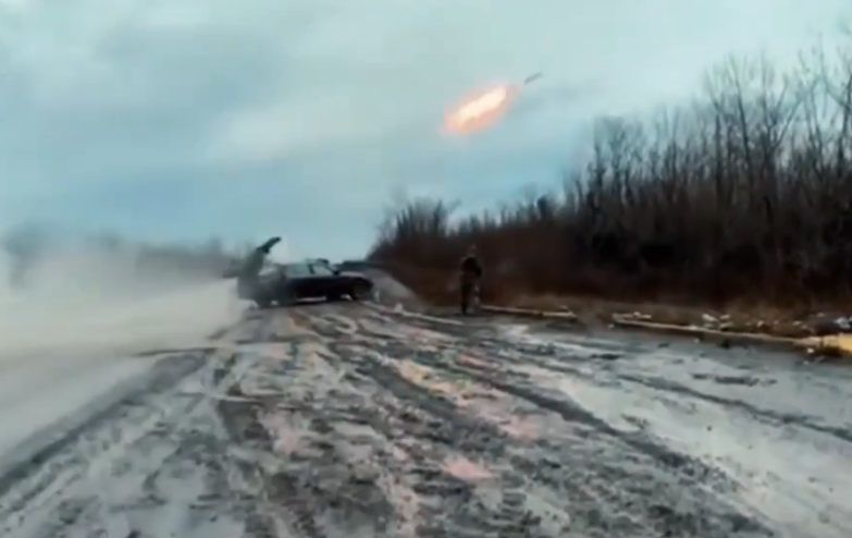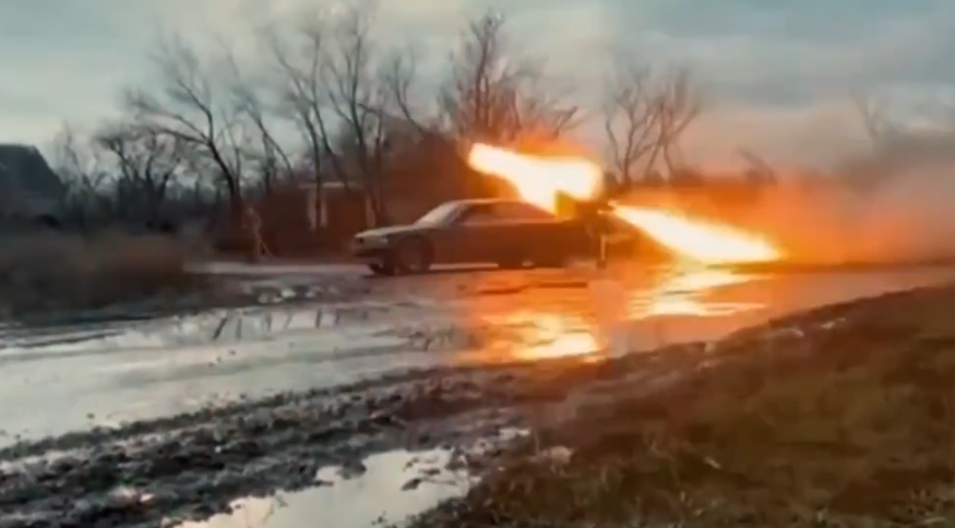 «Бахмут, українські військовослужбовці зі 114-ї бригади територіальної оборони перекинули на фронт РСЗВ BMW 3-series. На знімку видно, як вони обстрілюють російські позиції на сході від Кліщіївки 122-мм реактивними снарядами Град», – йдеться у публікації.
