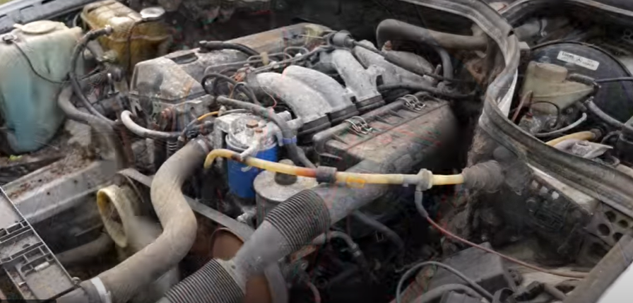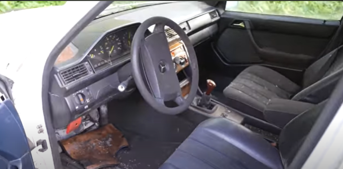 Салон німецького седана також забруднився та вигорів за роки простою. Моторний відсік теж брудний, але не зруйнований. В ньому лише немає акумулятора та не підключено шланги. У двигуні навіть є масло і воно досить чисте, як і повітряний фільтр.