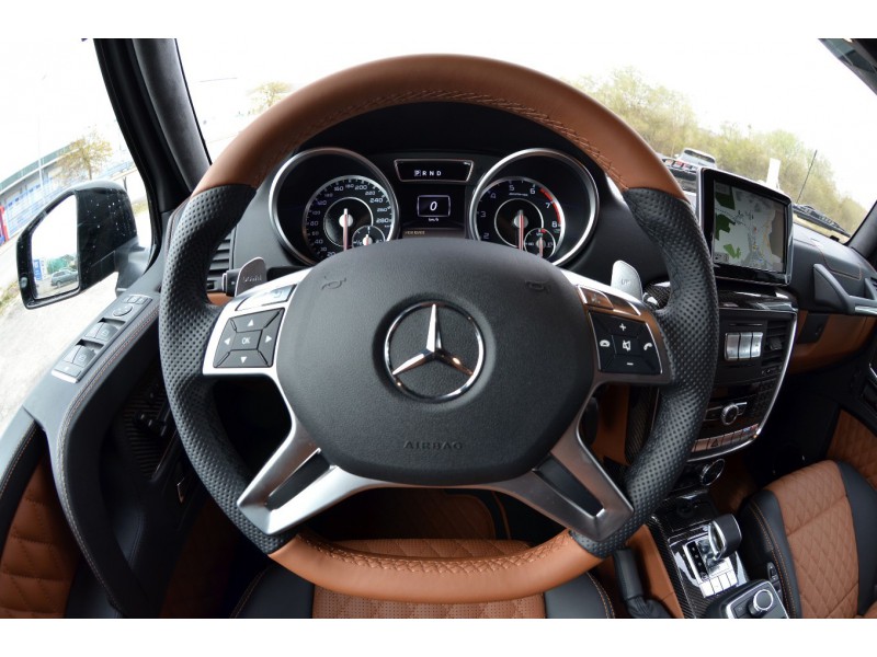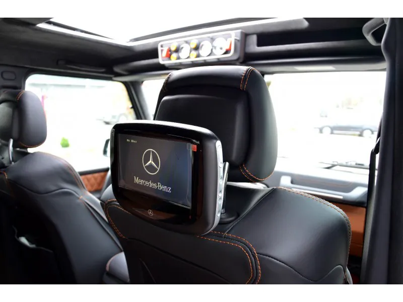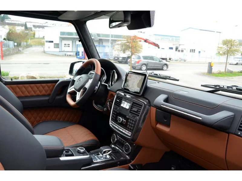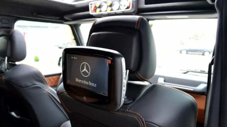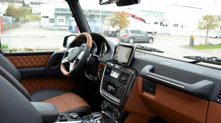 Салон выставленного на продажу Mercedes G63 AMG 6X6 отделан двухцветной кожей и карбоном. Кроме того, установлены опционные дисплеи для задних пассажиров.