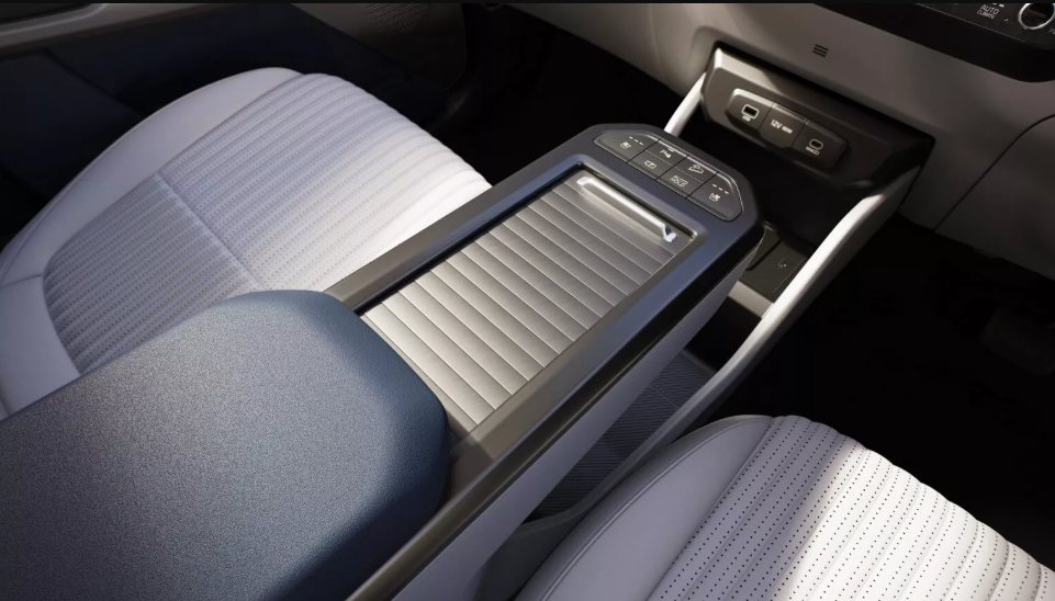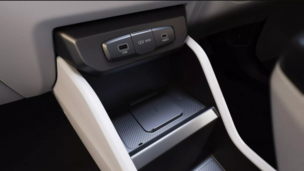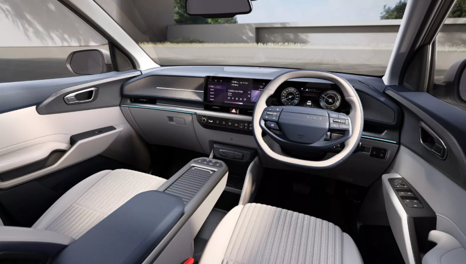 У салоні Carens Clavis EV збереглася трирядна компонування і він розрахований на сім сидінь. В оснащення включений 26,6-дюймовий екран, який об’єднує у собі цифрову приладову панель і мультимедійних потреб. Замість центрального тунелю встановлений масивний підлокітник з кнопковим блоком, селектор трансмісії авто встановлений на рульовій колонці, сидіння отримали функцію вентиляції, є аудіосистема Bose з вісьмома динаміками, фонове підсвічування і панорамний люк.