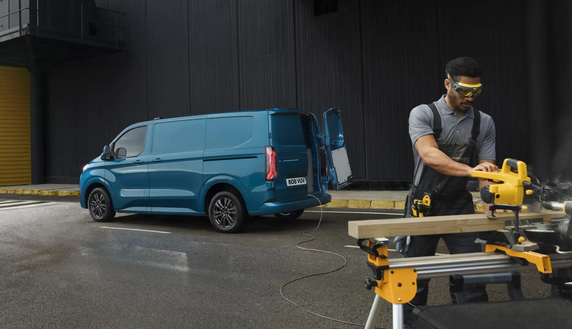 Ford стверджує, що створив Custom з нуля, але зовнішність електрокара вийшла цілком впізнаваною. У порівнянні з попередником, у фургона більша решітка радіатора і нові фари. Також у нього покращена на 10% аеродинаміка. Салон при цьому виглядає інакше. У оснащення увійшла цифрова панель приладів, мультимедійна система SYNC 4 з 13-дюймовим екраном і особливе рульове колесо, яке може розкладатися вперед, перетворюючись на зручний столик або підставку для гаджетів.