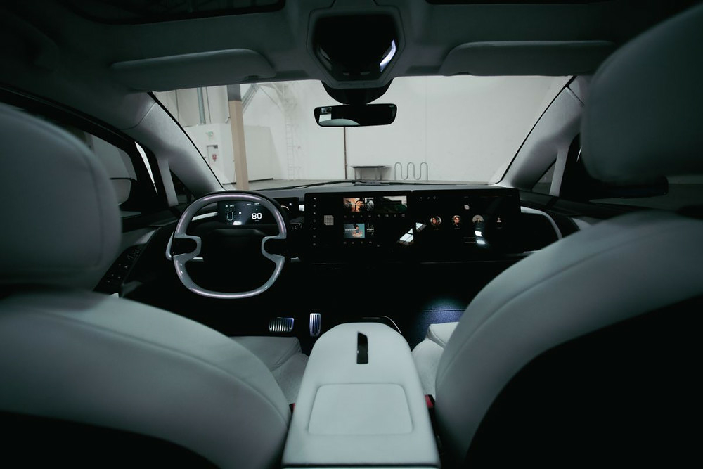 В ролі щитка приладів виступає невеликий дисплей, встановлений за кермовим колесом. Додаткові екрани передбачені і для пасажирів другого ряду. Оздоблення салону виконане з екологічних тканин. Серед доступних електронних помічників — автопілот другого рівня, а також зовнішні та внутрішні камери, які дають змогу знімати стріми під час руху і проводити Zoom-конференції. До того ж новинка отримала максимальний пакет систем допомоги водієві.