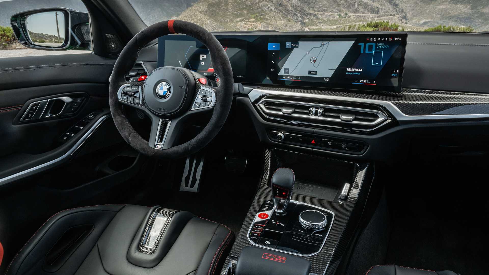 У салоні — штатний для M3 вигнутий екран системи iDrive 8, який поєднує 14,9-дюймовий дисплей мультимедійної системи та 12,3-дюймову панель приладів.